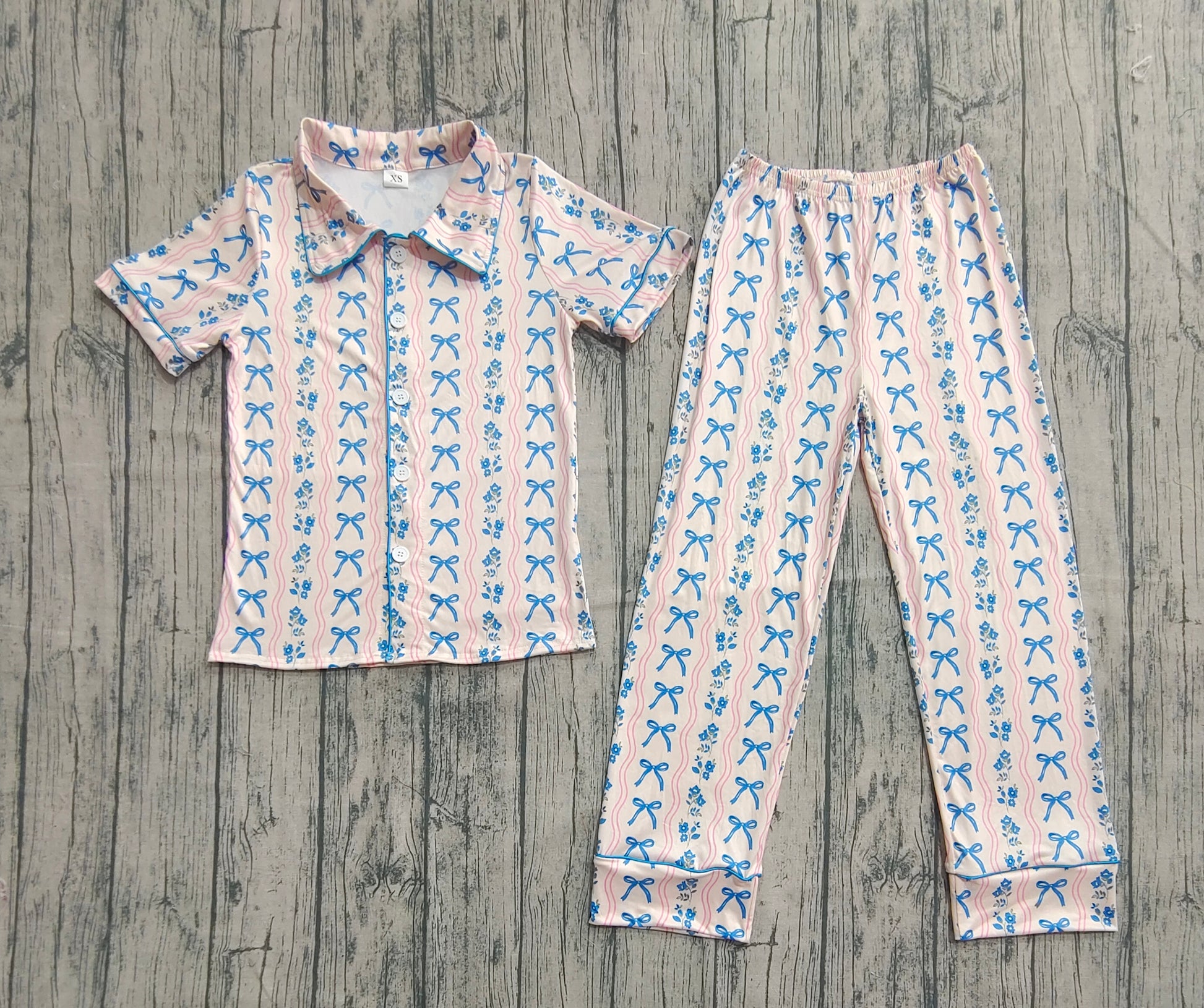 Adult Women Blue Bows Flowers Stripe Button Top Pant Pajamas Sets