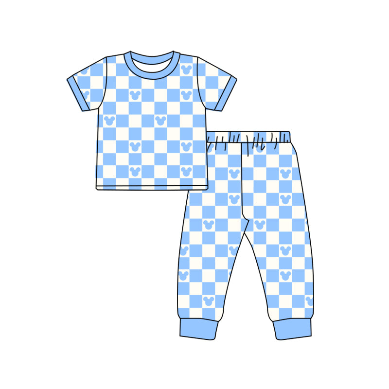 Baby Boys Cartoon Blue Checkered Mouse Short Sleeve Shirt Pants Pajamas Clothing Sets Preorder(moq 5)