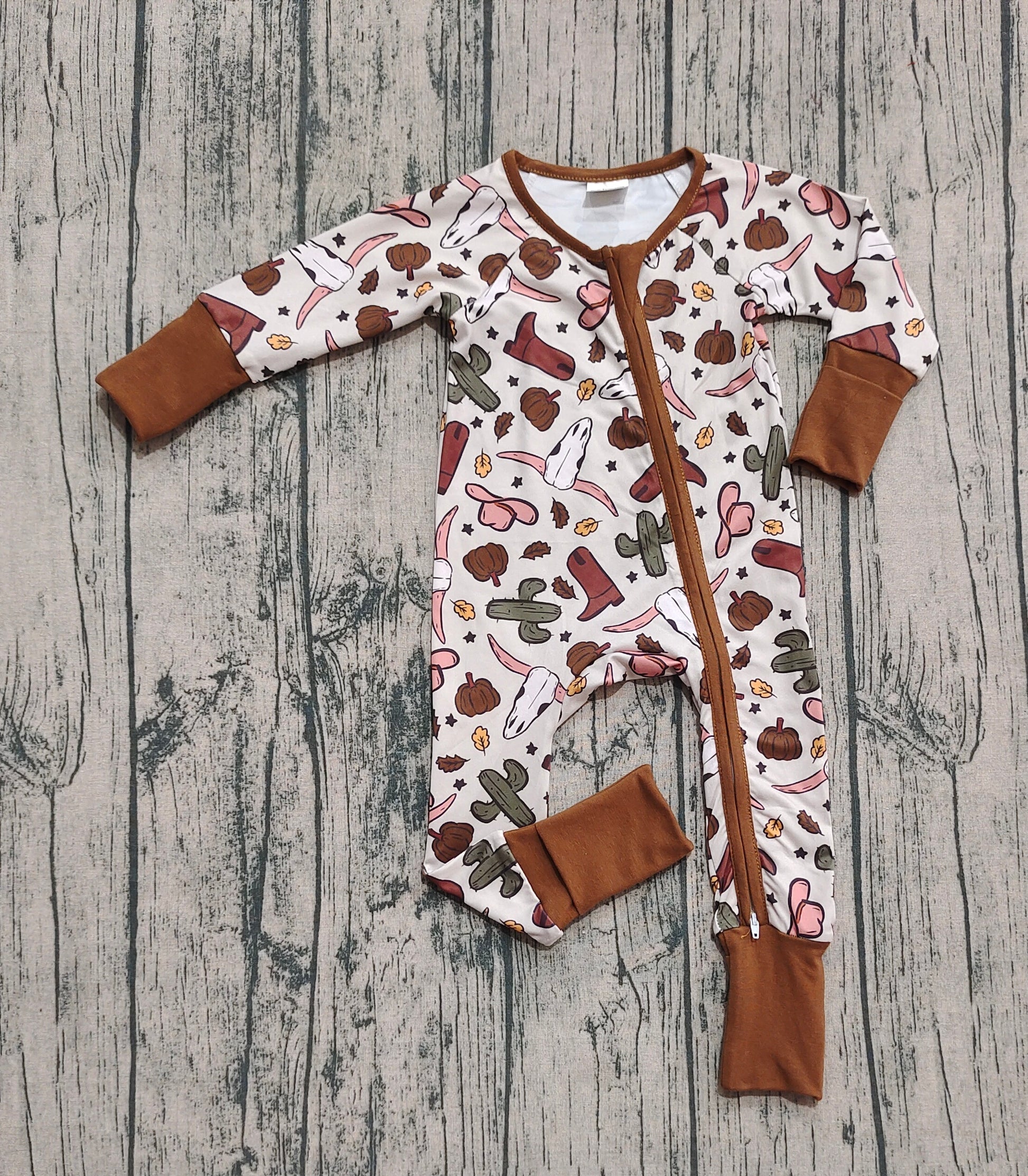 Baby Boys Western Brown Long Sleeves Bull Skull Cactus Zipper Rompers
