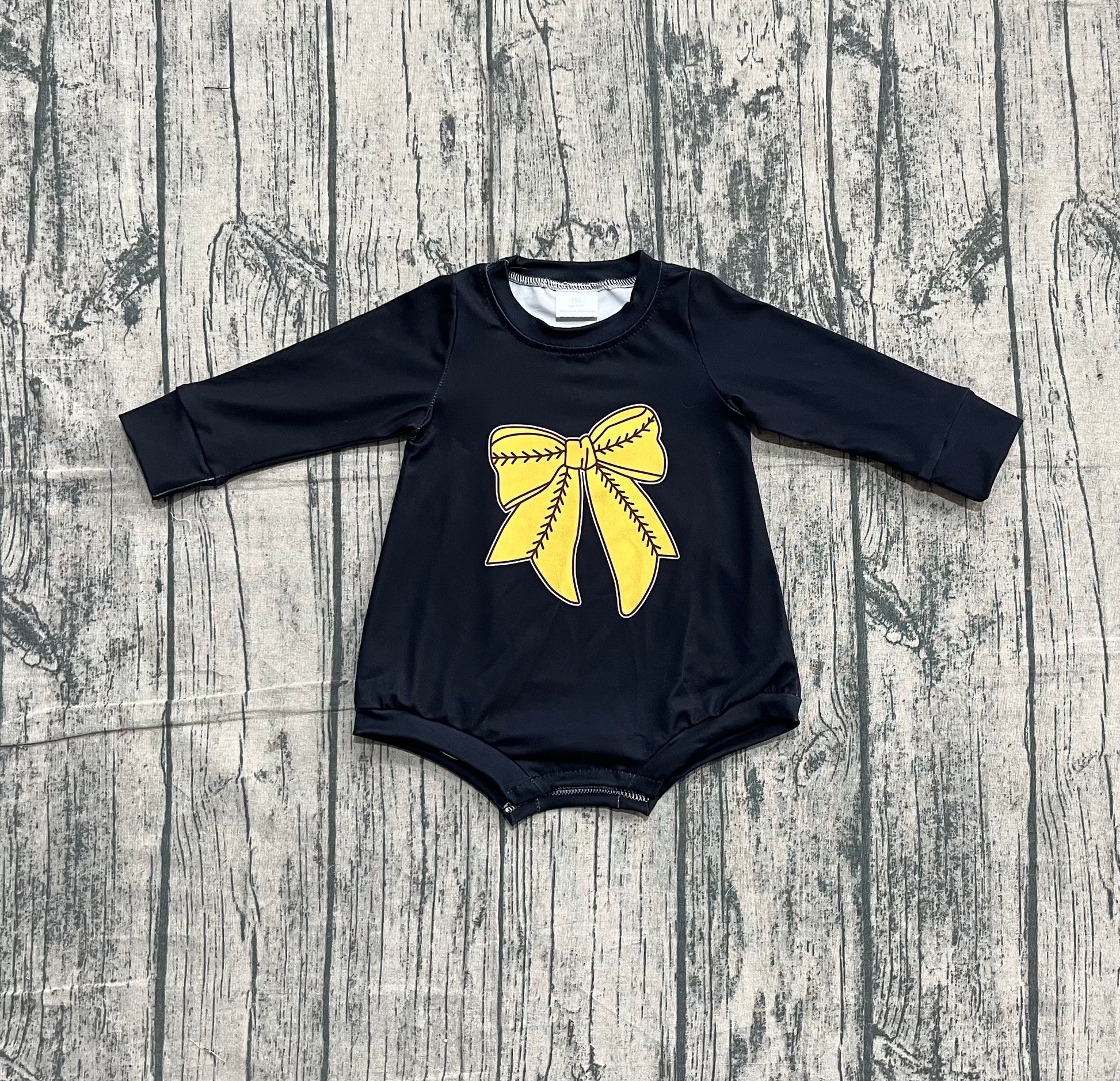 Baby Girls Black Long Sleeve Gold Baseballs Bows Team Rompers