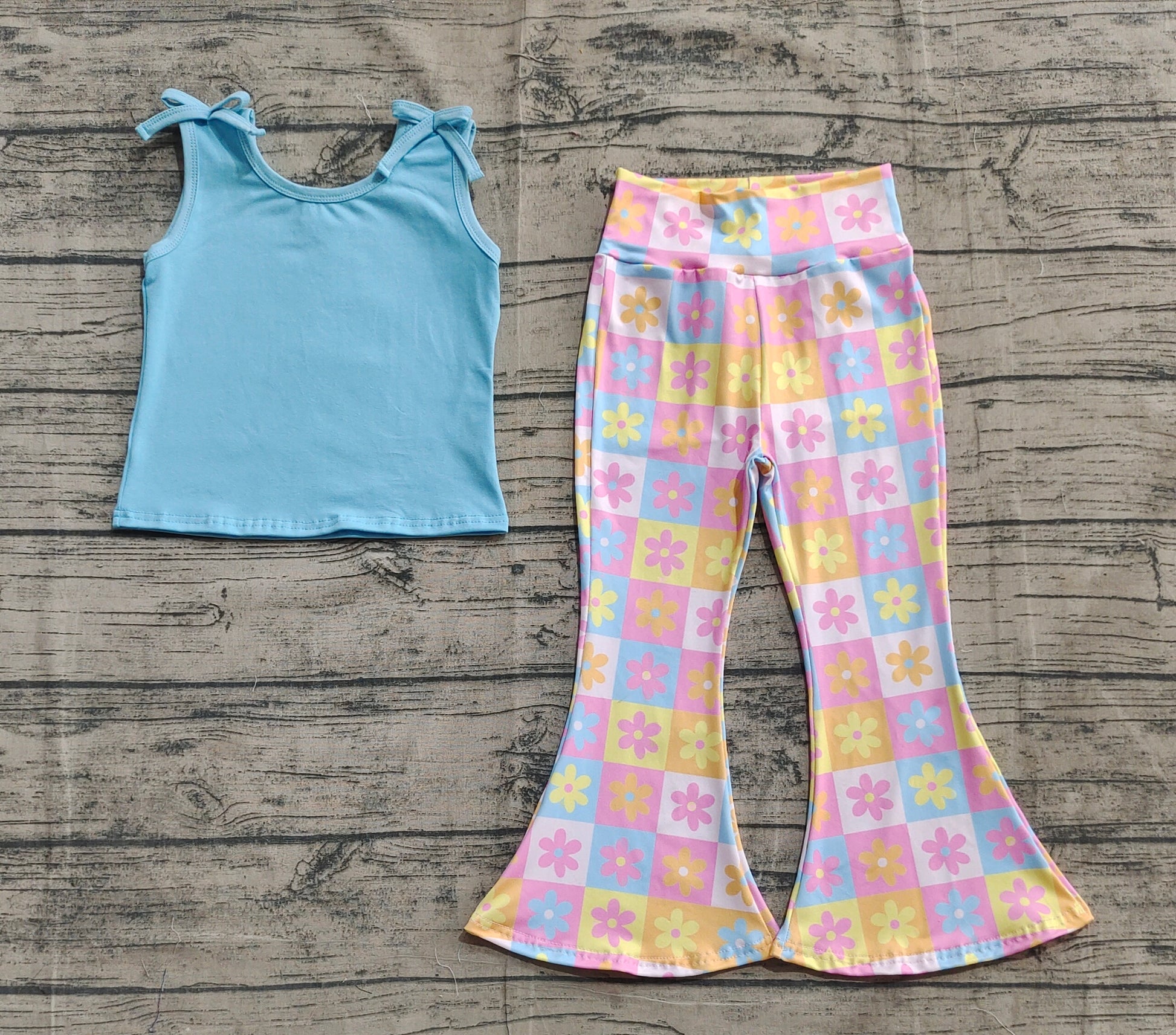 Baby Girls Blue Top Flowers Plaid Bell Bottom Pants Sets