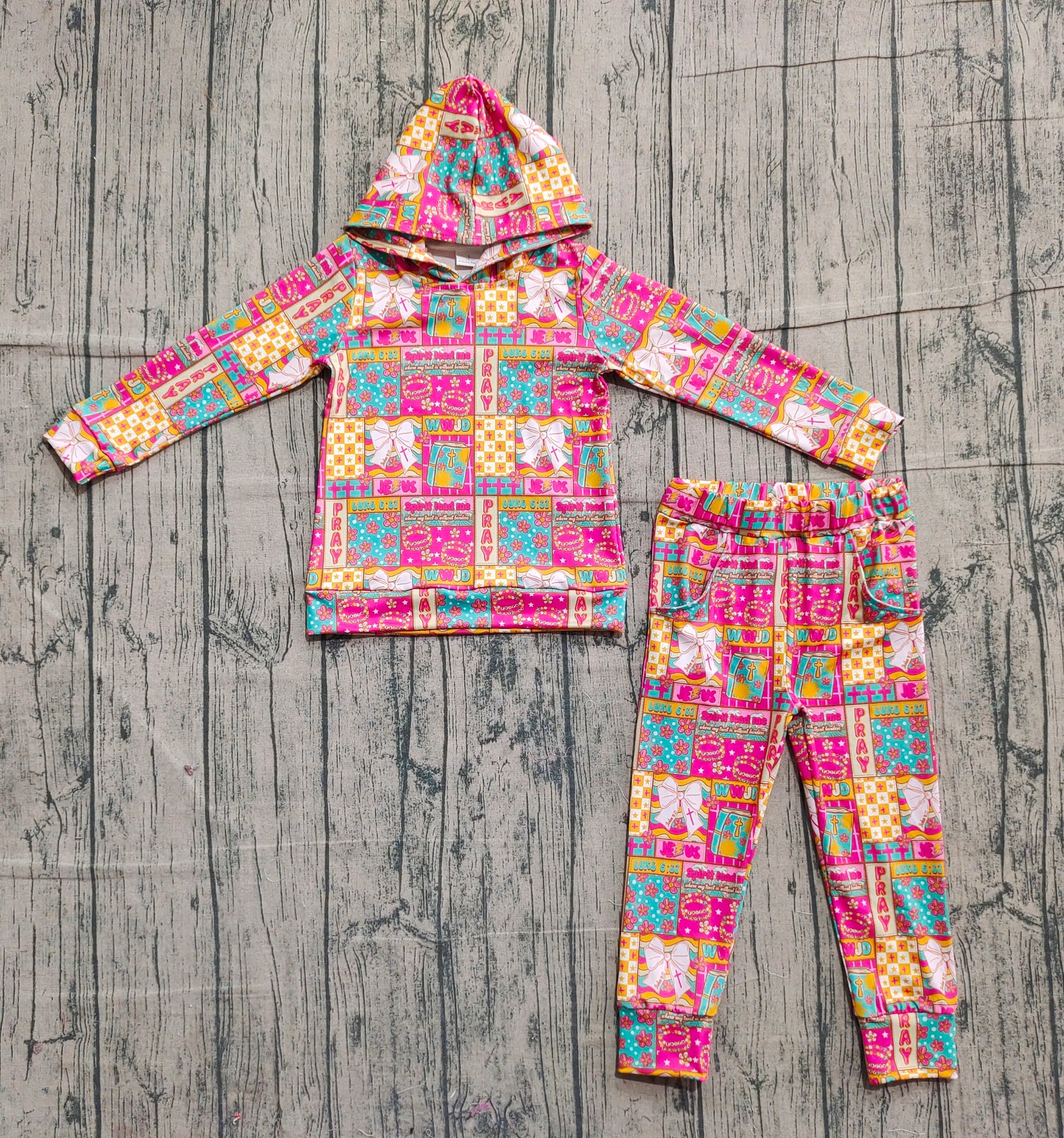 Baby Girls Bows Flowers Pray Checked Hoodies Pockets Jogger Pants Clothes Sets