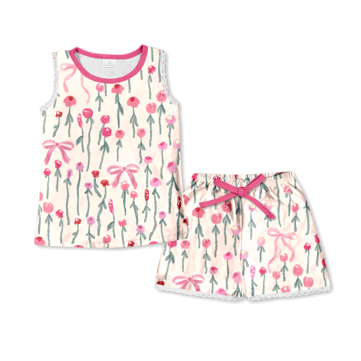 Baby Girls Bows Flowers Sleeveless Shirt Top Shorts Pajamas Clothes Sets Preorder(moq 5)