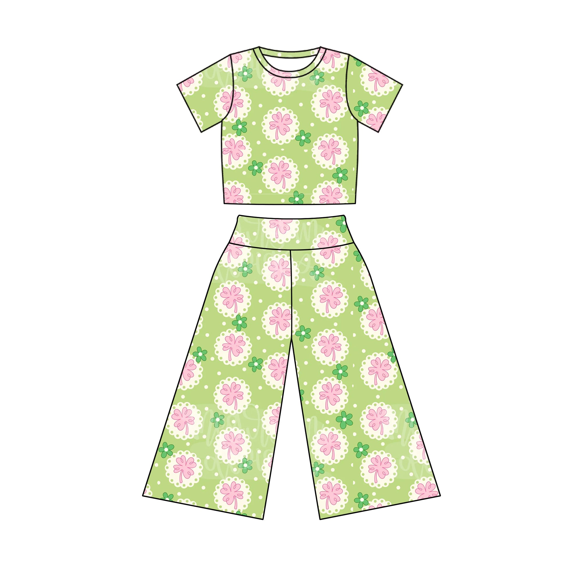 Baby Girls Green Pink Flowers Shirt Bell Pants Clothes Sets Preorder