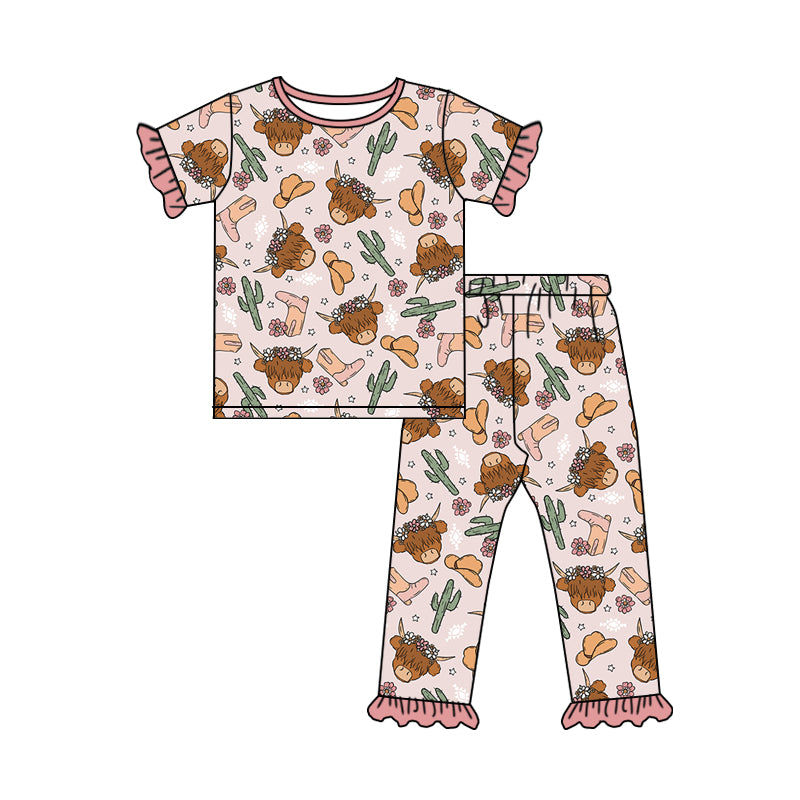 Baby Girls Highland Cows Western Top Flowers Pants Pajamas Clothes Sets Preorder(moq 5)