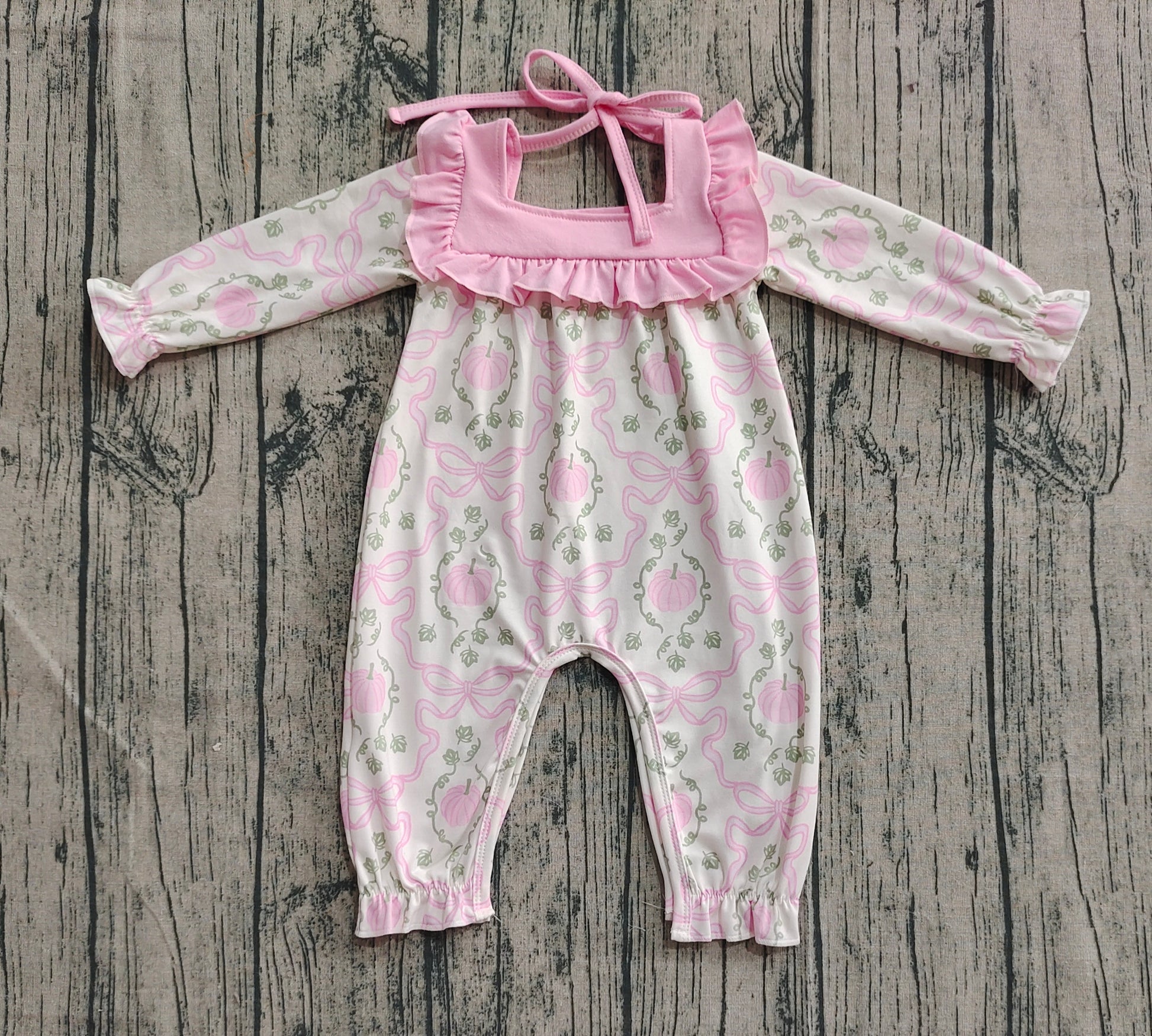 Baby Girls Long Ruffle Sleeves Pink Pumpkins Bows Plaid Pant Rompers