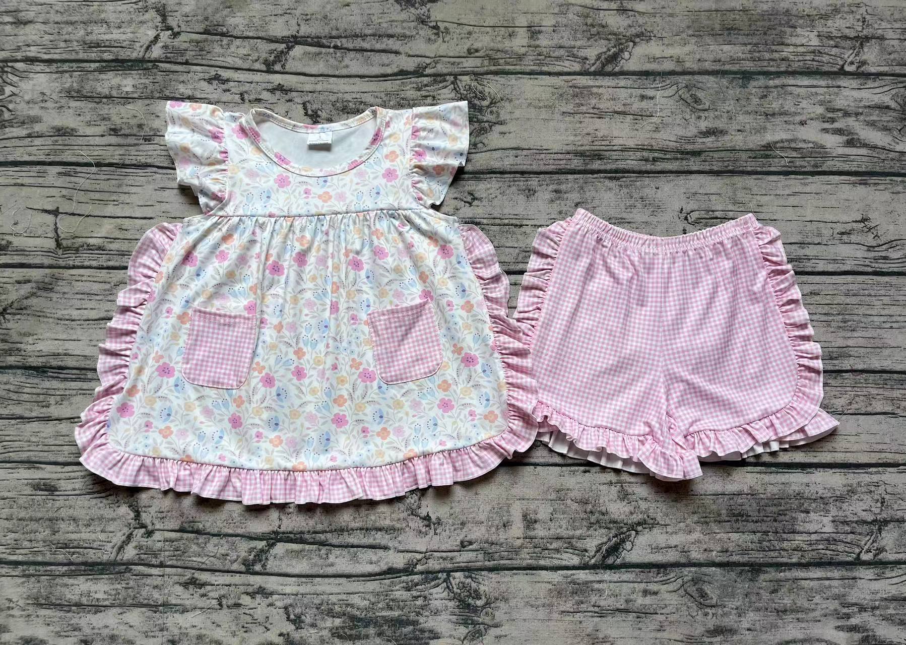 Baby Girls Pink Flowers Pockets Tunic Top Ruffle Shorts Clothes Sets