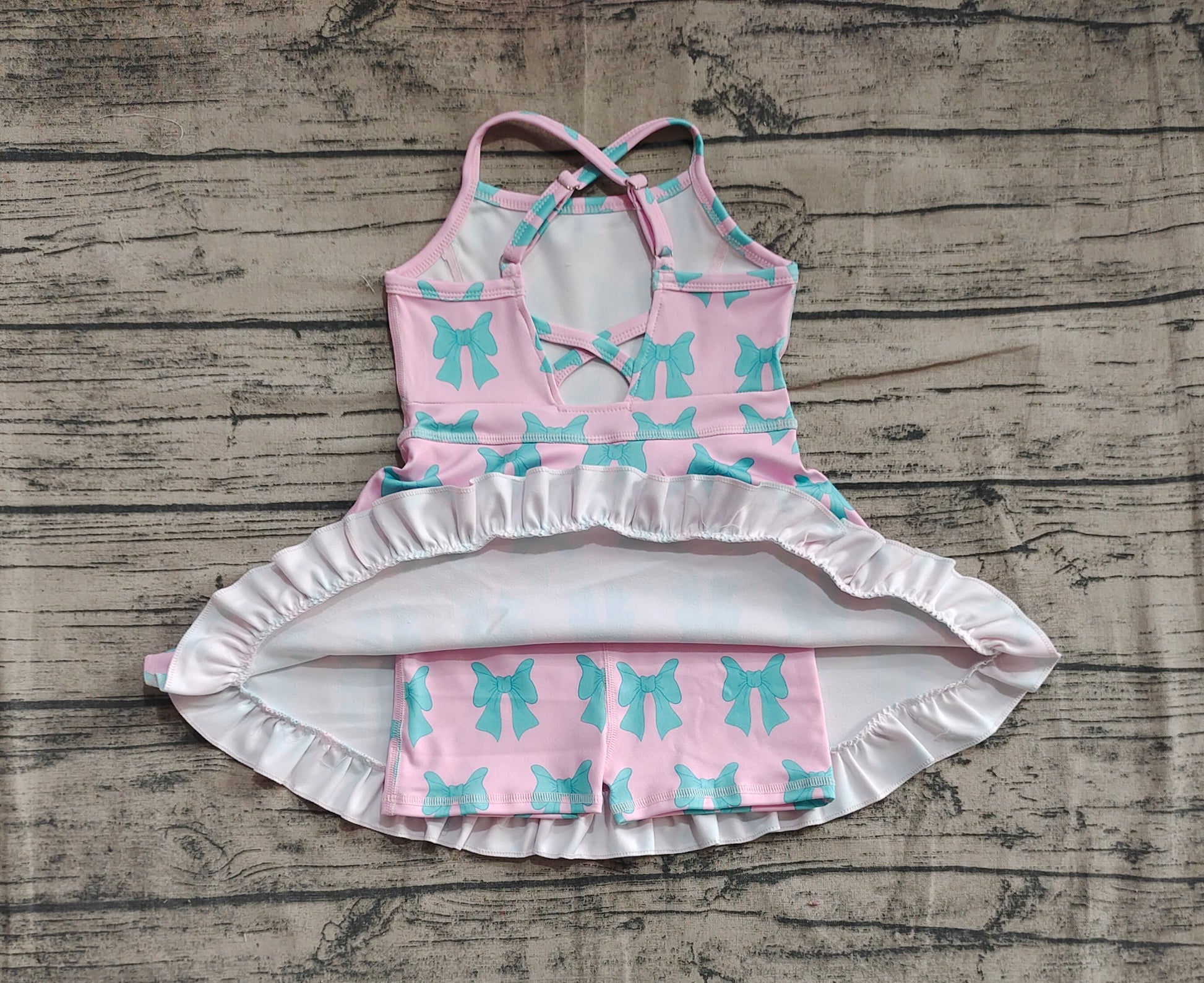 Baby Girls Pink Strap Green Bows Yoga Ruffle Knee Length Dresses