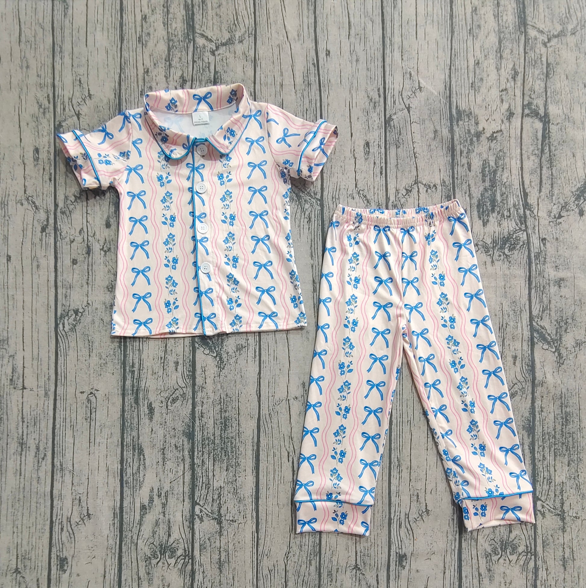 Baby Girls Short Sleeves Blue Bows Flower Stripe Top Pants Pajamas Sets