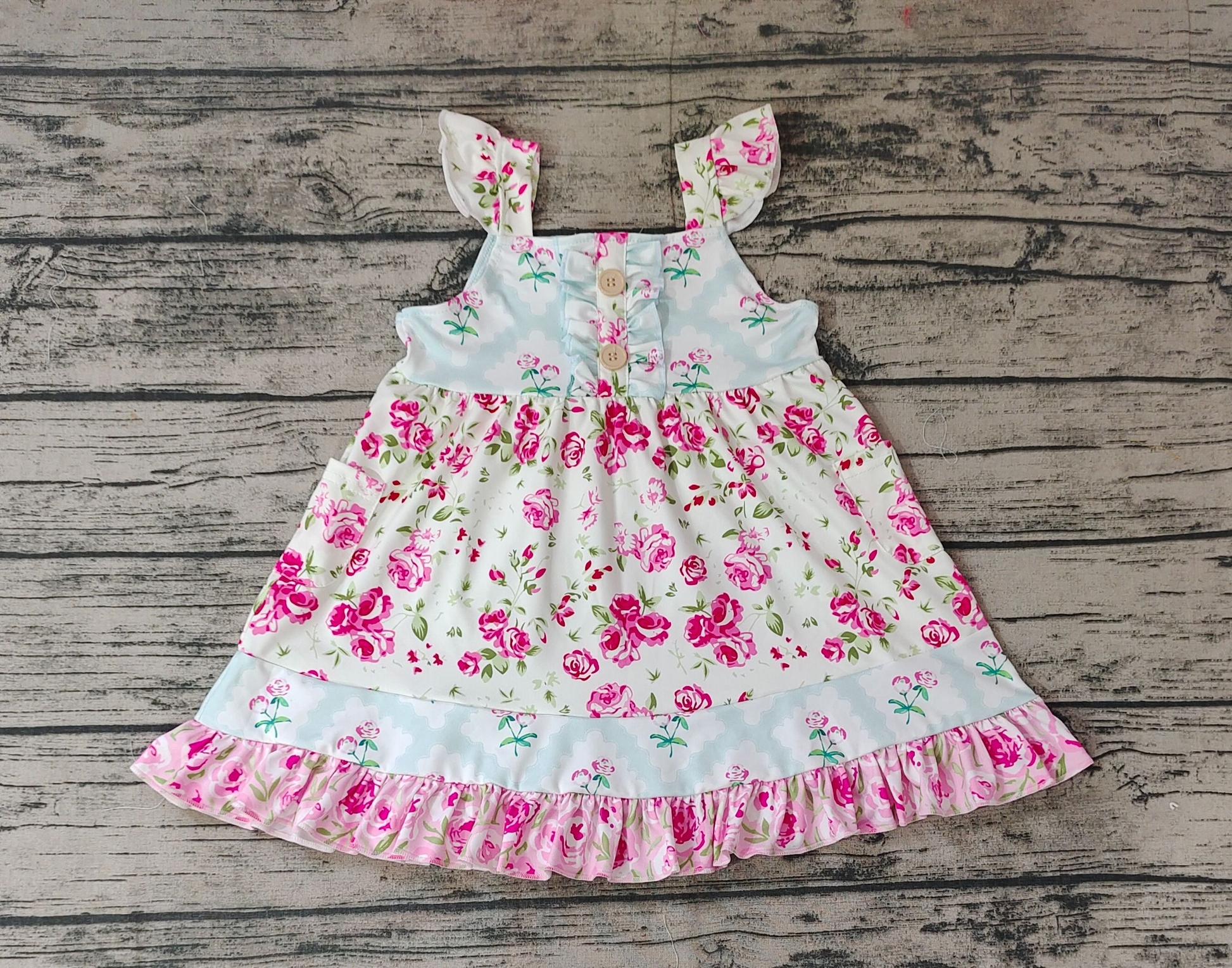Baby Girls Straps Pink Flowers Ruffle Knee Length Dresses