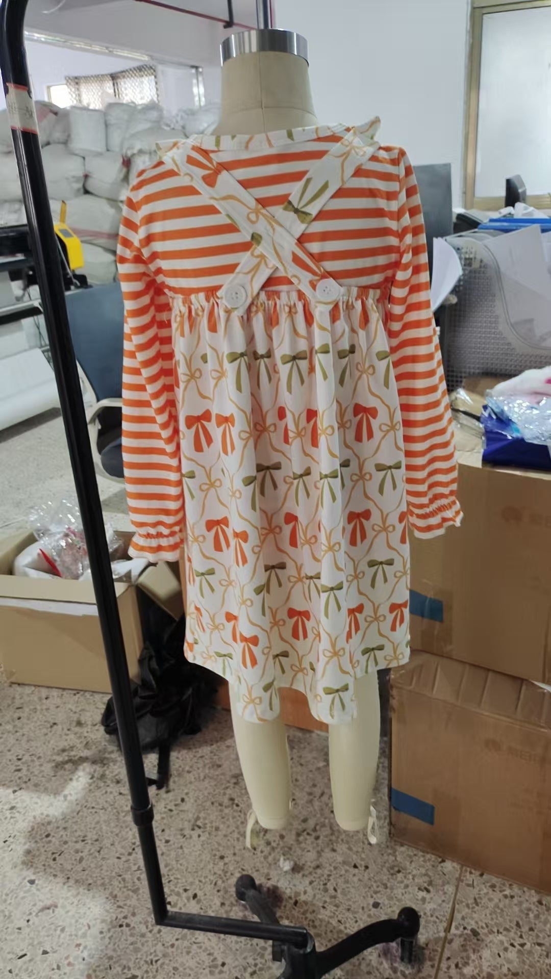 Baby Girls Stripe Bows Top Pockets Knee Length Dresses 2pcs Clothes Sets