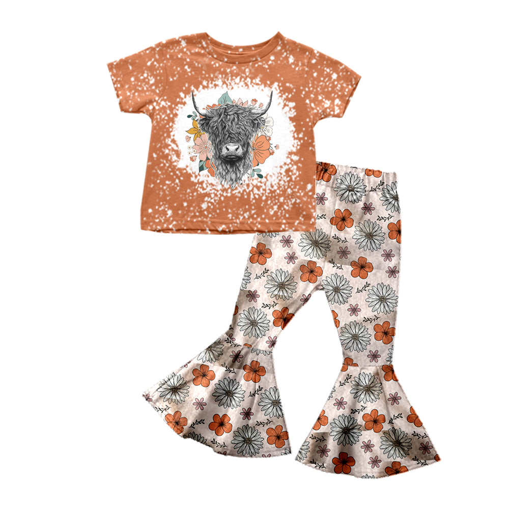 Baby Girls Western Flowers Cow Tee Top Bell Pants Clothes Sets preorder (moq 5)