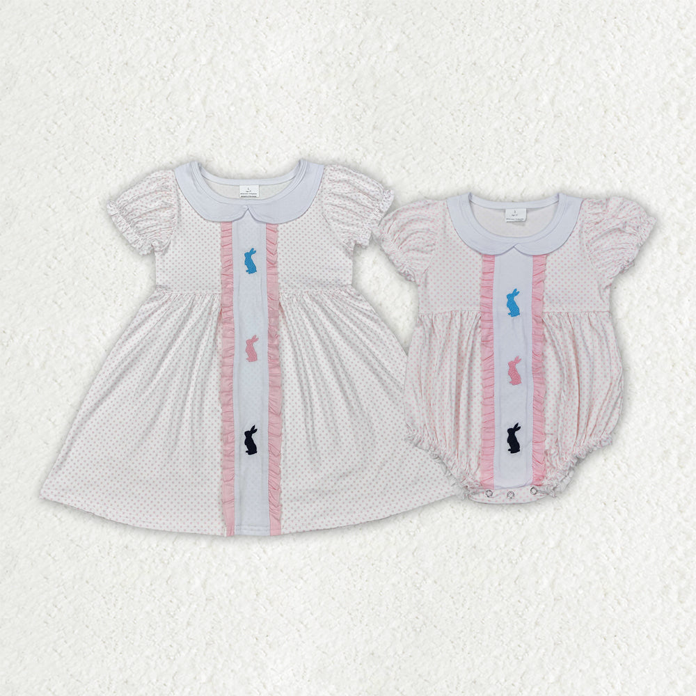 Embroidery Baby Girls Easter Rabbits Polka Dots Rompers Dresses