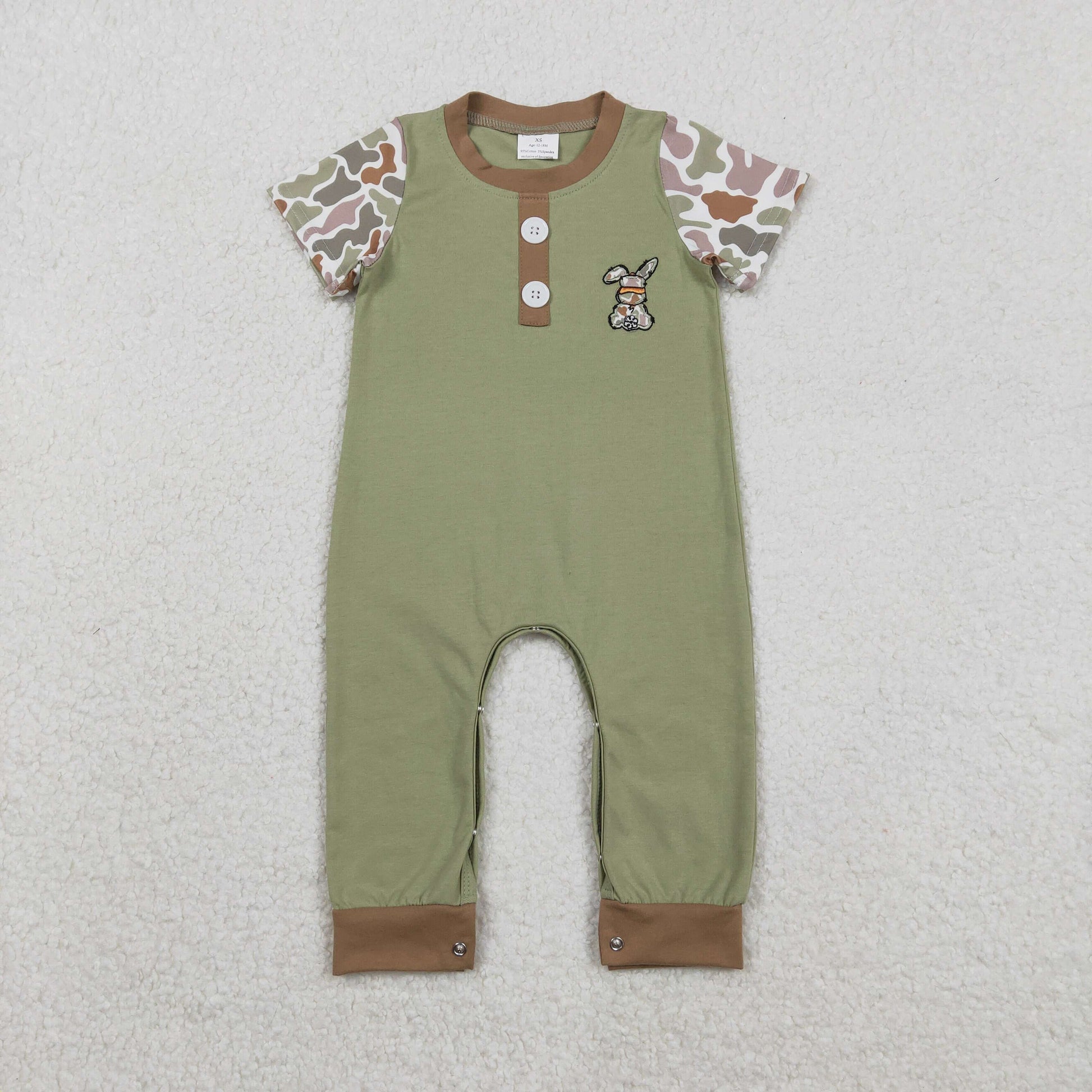 Embroidery Camo Rabbit Baby Boys Button Easter Footie Rompers