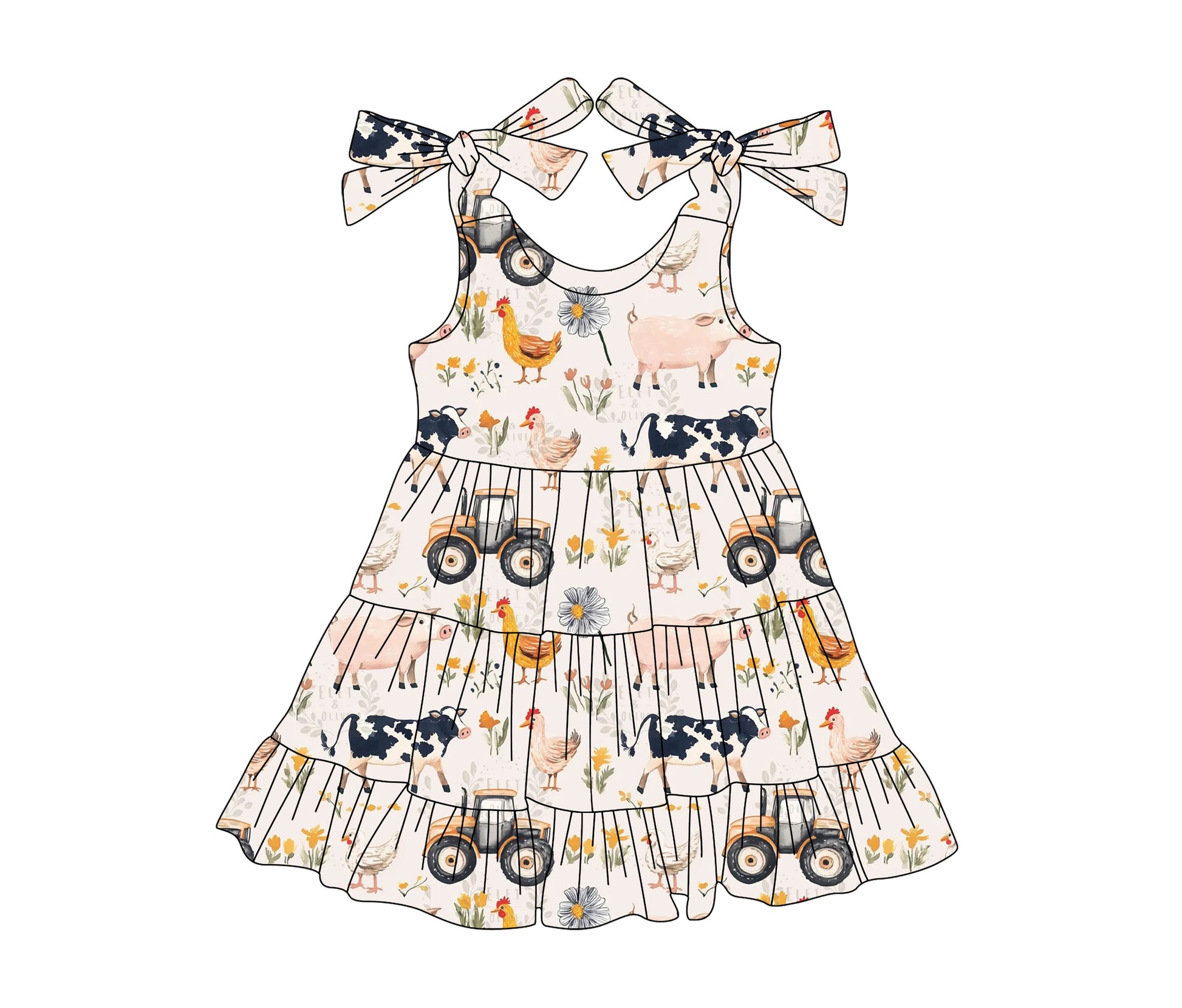 Baby Girls Pink Strap Trucks Chicks Cows Farm Knee Length Dresses Preorder