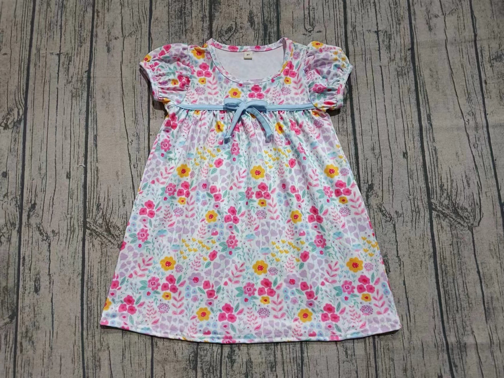 Preorder moq 5 Baby Girls Short Ruffle Sleeves Pink Lavender Floral Bow Knee Length Dresses