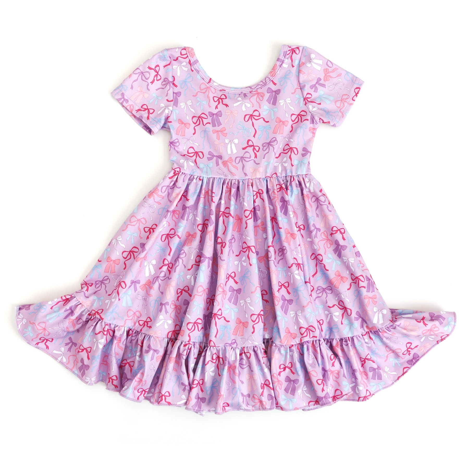 Baby Girls Short Sleeves Lavender Bows Ruffle Knee Length Dresses Preorder