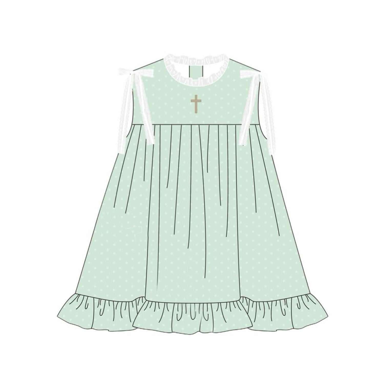 Baby Girls Green Polka Dots Cross Easter Ruffle Knee Length Dresses Preorder