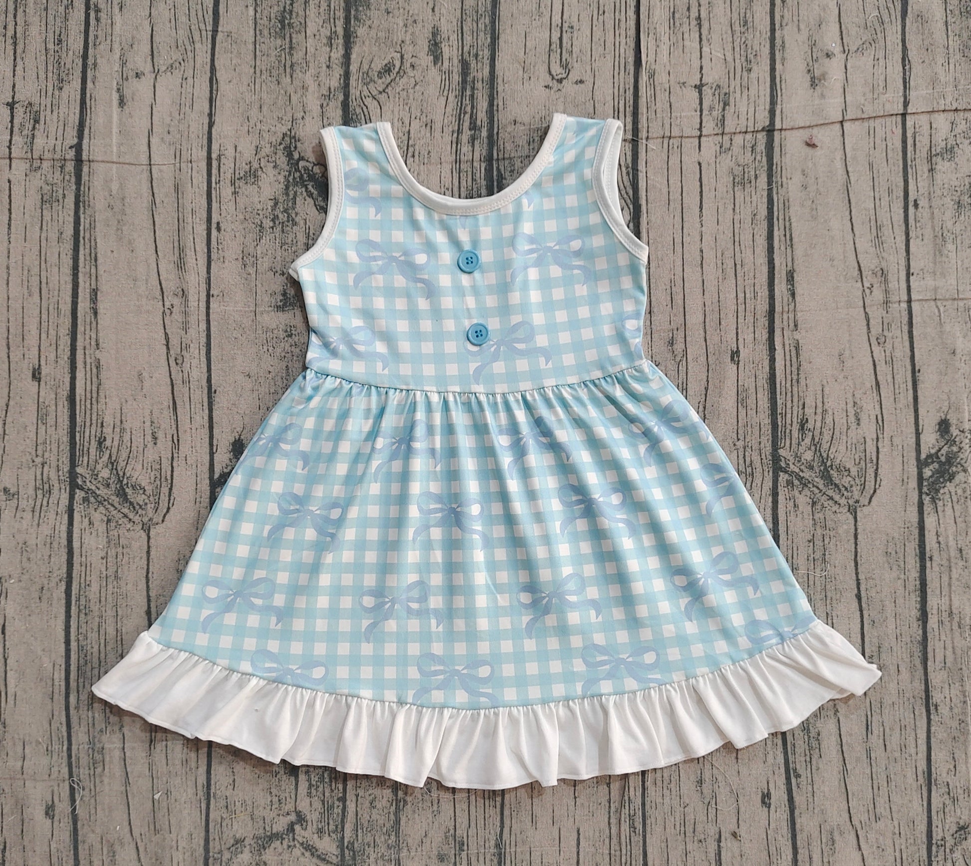 Baby Girls Blue Checked Bows Sleeveless Ruffle Knee Length Dresses Preorder