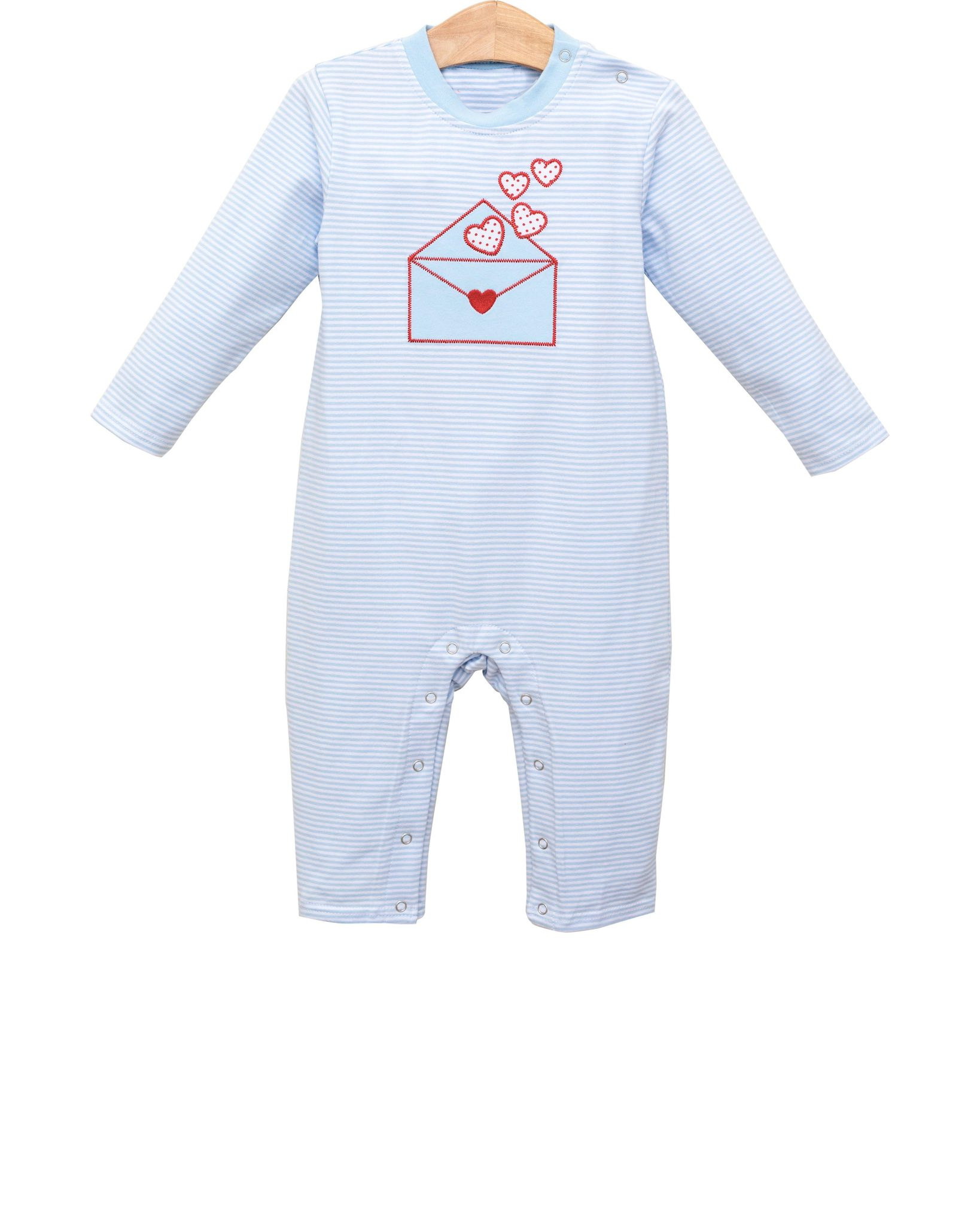 Baby Boys Long Sleeve Blue Stripe Hearts Letters Valentines Footie Rompers Preorder