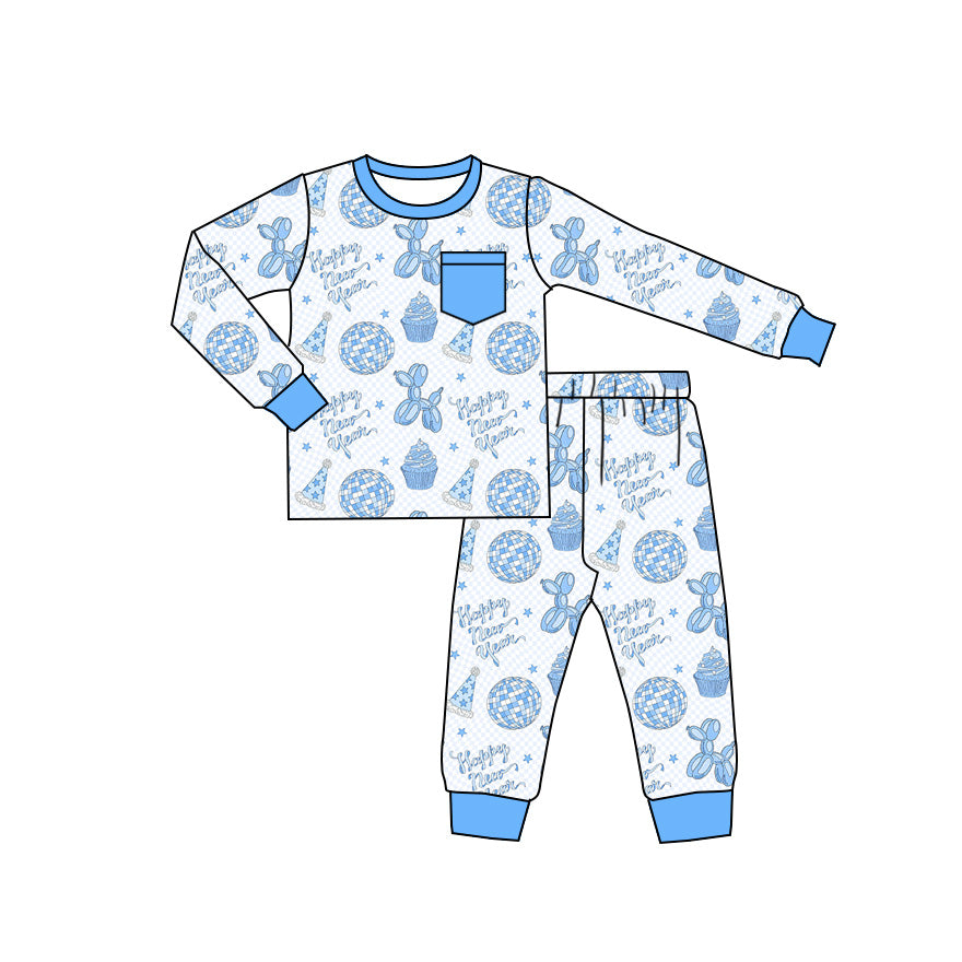 Preorder (moq 20)Baby Boys Bamboo Balloon Dogs Happy New Year Pocket Pajamas Sets