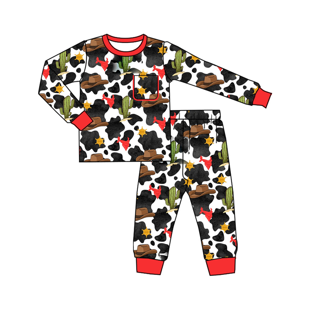 Preorder (moq 20)Baby Boys Bamboo Western Black Cow Cactus Top Pants Pajamas Sets