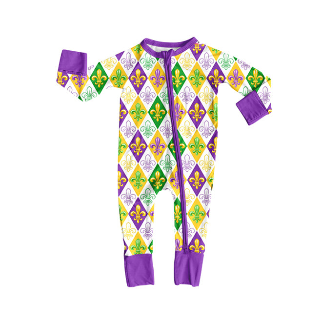 Preorder (moq 20)Baby Girls Bamboo Mardi Gras Anchors Checked Zippy Footie Rompers