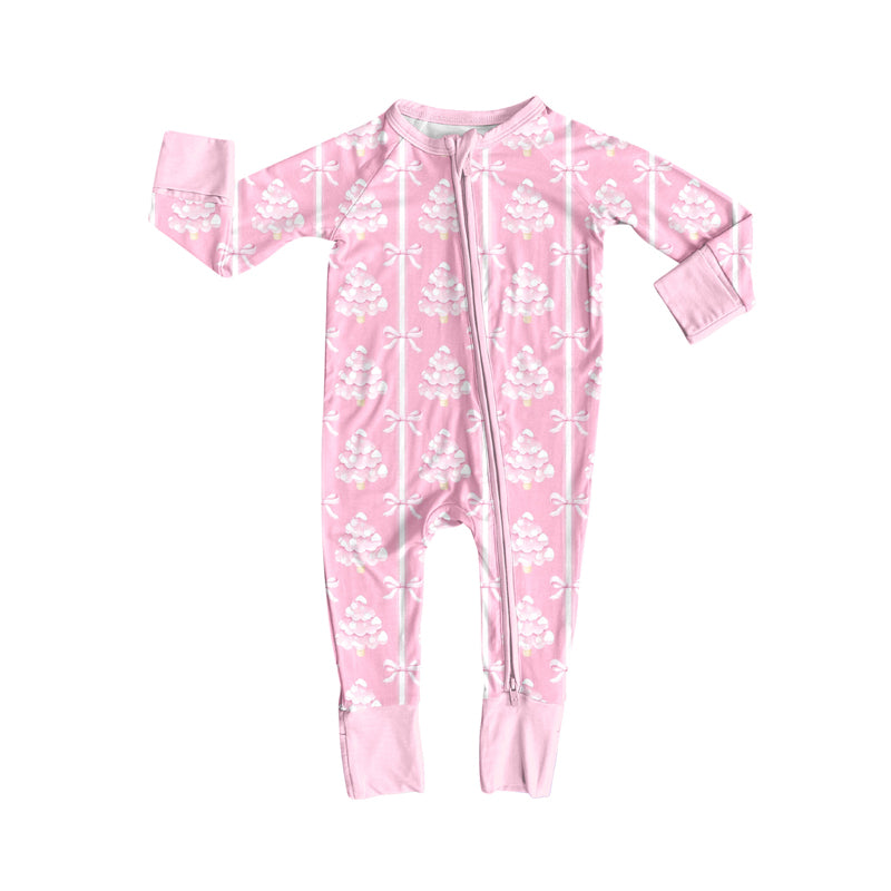 Preorder (moq 20)Baby Girls Bamboo Pink Bows Trees Stripe Christmas Zippy Footie Rompers