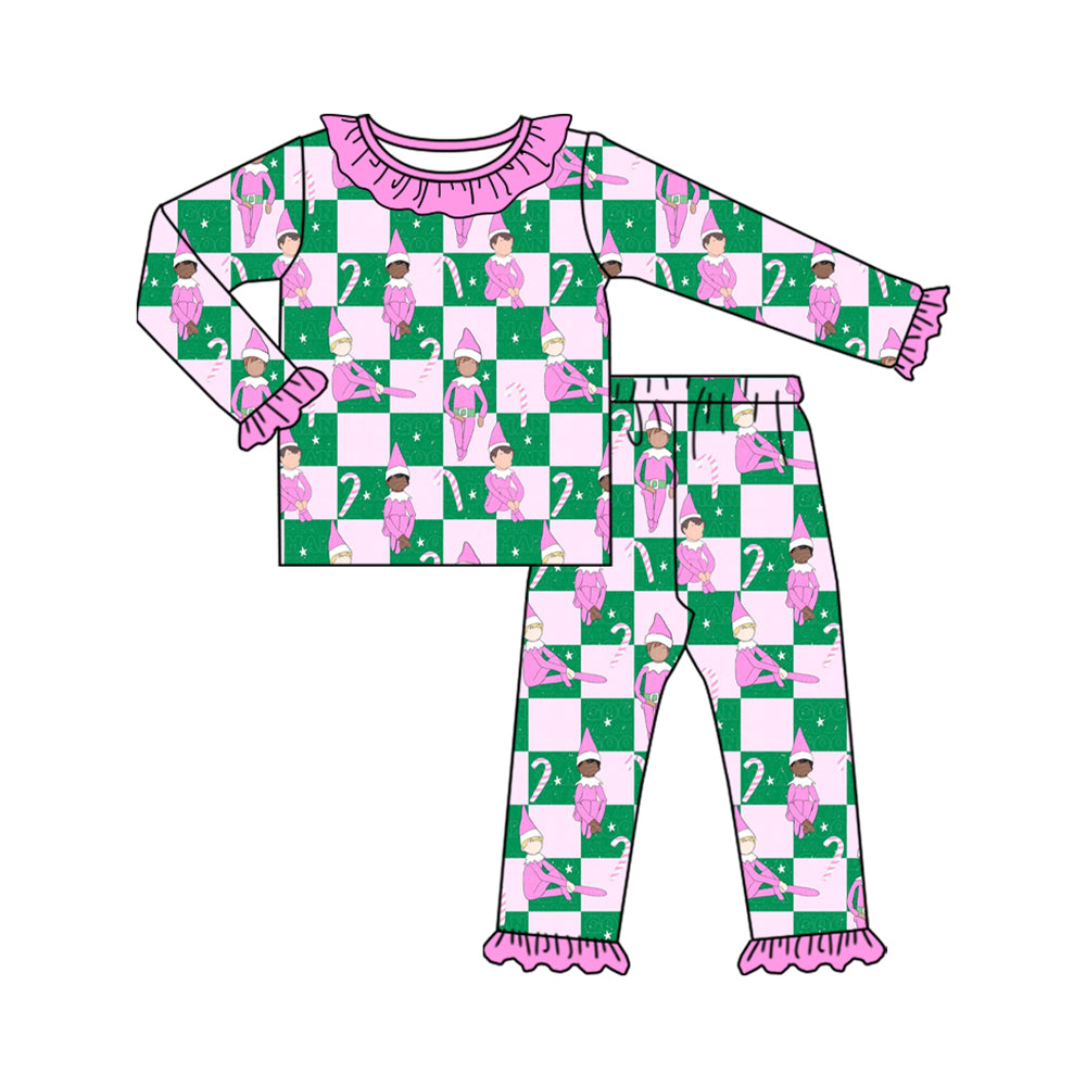 Preorder (moq 20)Baby Girls Bamboo Pink Green Checked Elf Candy Cane Christmas Ruffle Pajamas Sets