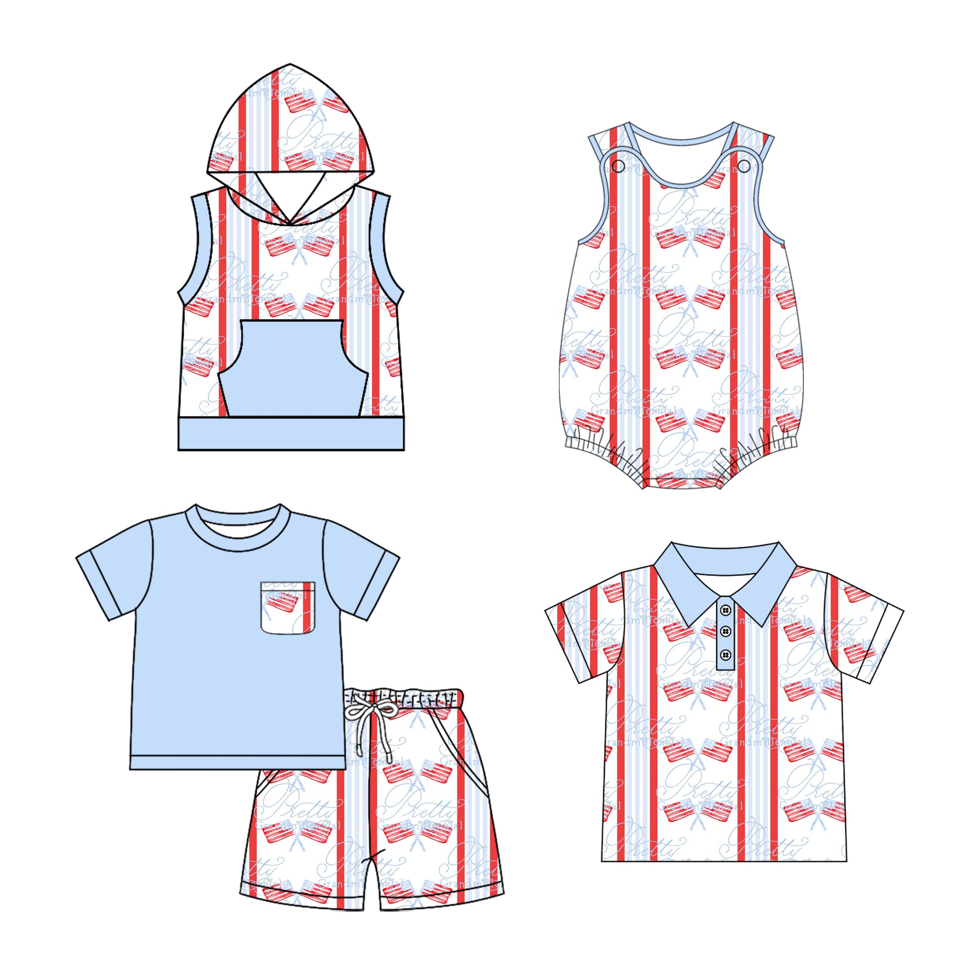 Preorder moq 5 Custom Baby Boys Light Blue Flags Button Polo Shirts Set Hoodie Top And Rompers
