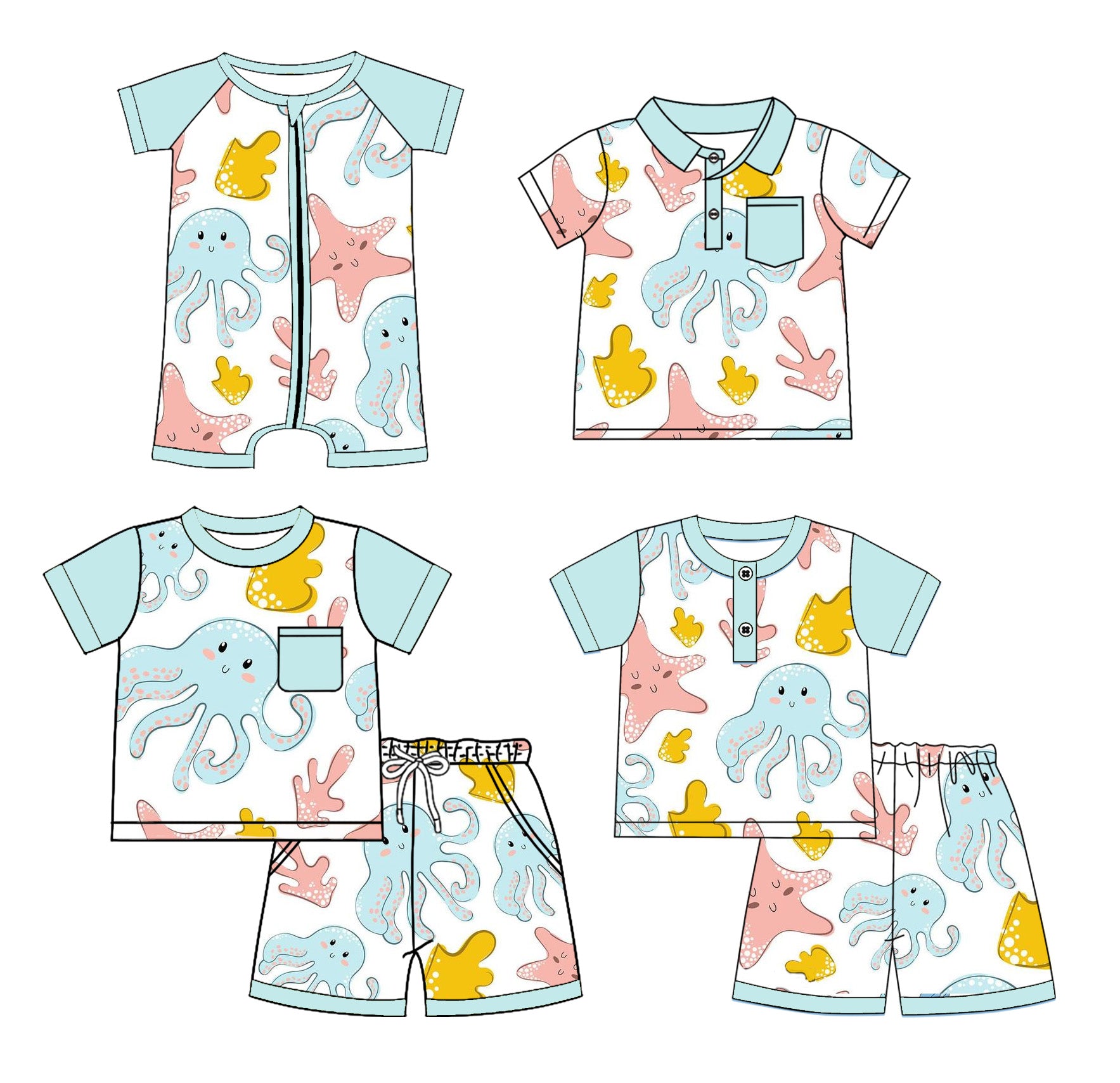 Preorder moq 5 Custom Baby Boys Light Blue Short Sleeves Sea World Top Short Pajamas Set Polo Shirts And Zipper Rompers