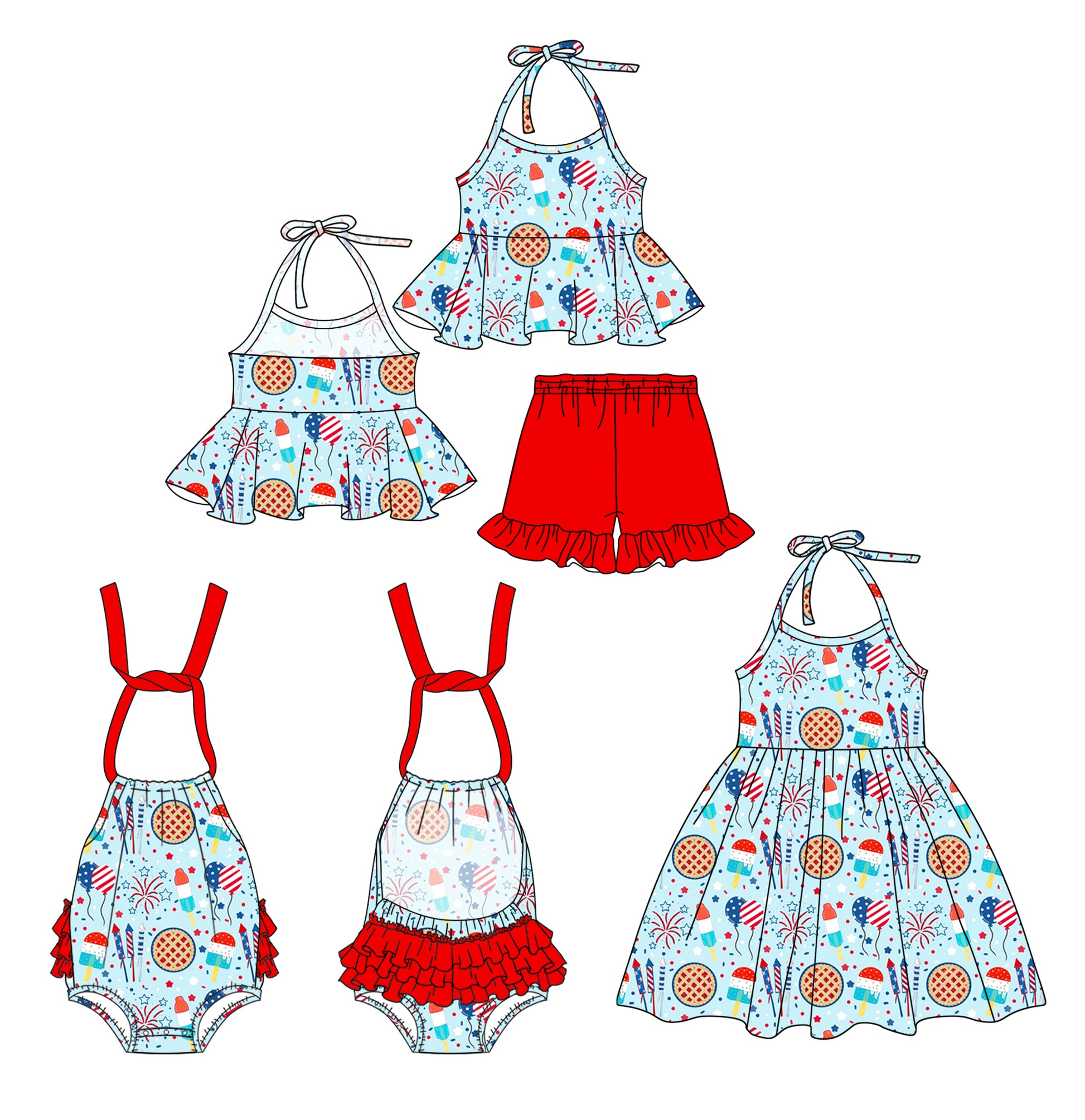 Preorder moq 5 Custom Baby Girls Blue Strap Firework Tunic Ruffle Short 4th Of July Set Knee Length Dress Romper