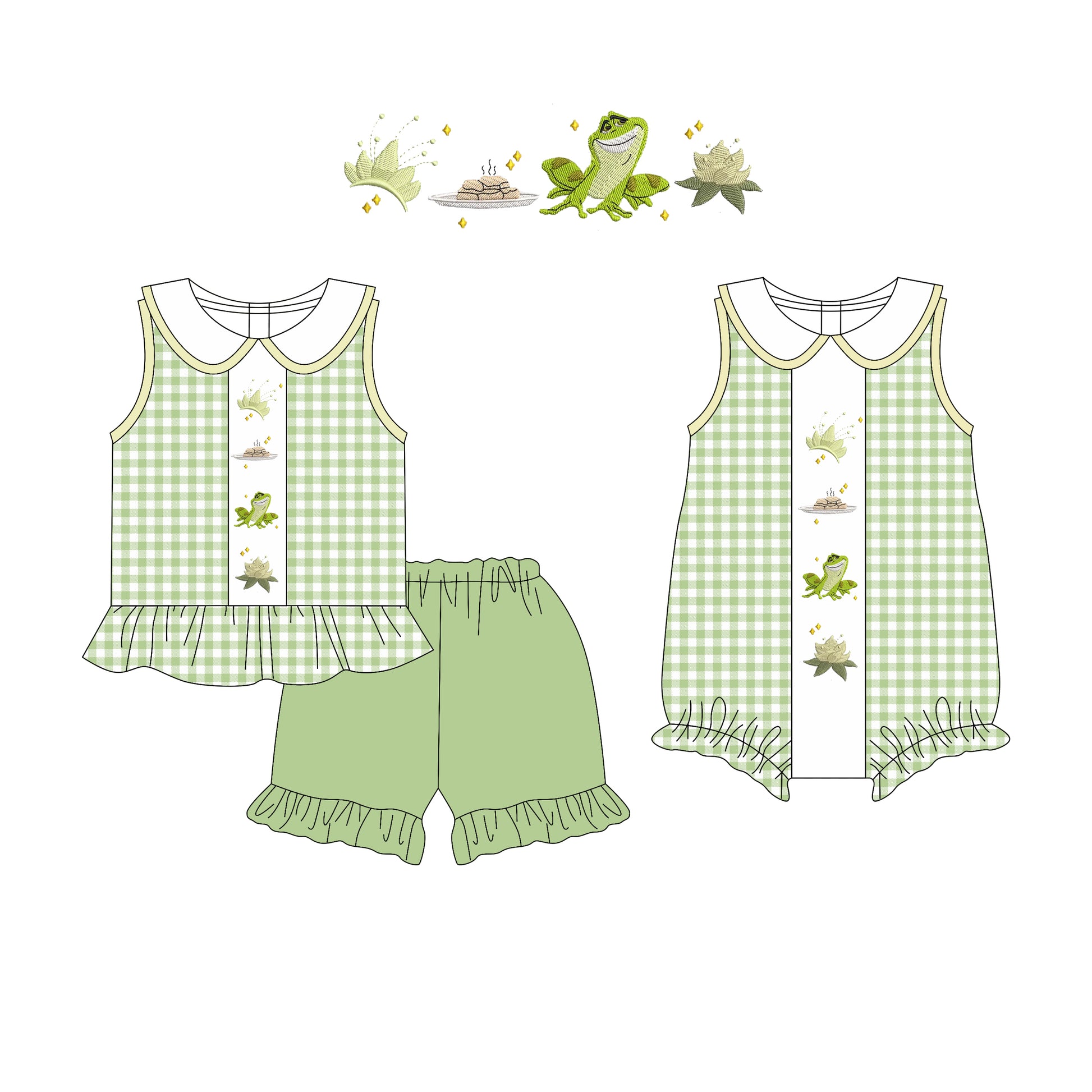 Preorder moq 5 Custom Baby Girls Green Plaid Sleeveless Frogs Tunic Ruffle Short Set Rompers