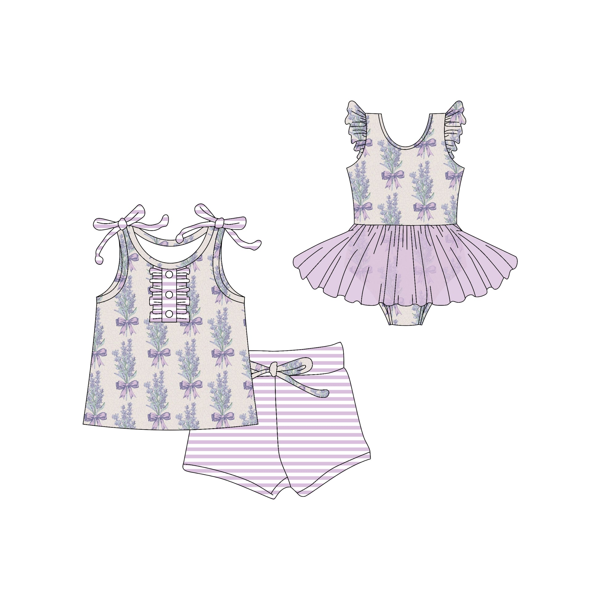 Preorder moq 5 Custom Baby Girls Lavender Strap Floral Bows Button Top Stripe Short Set Skort Bummise Romper