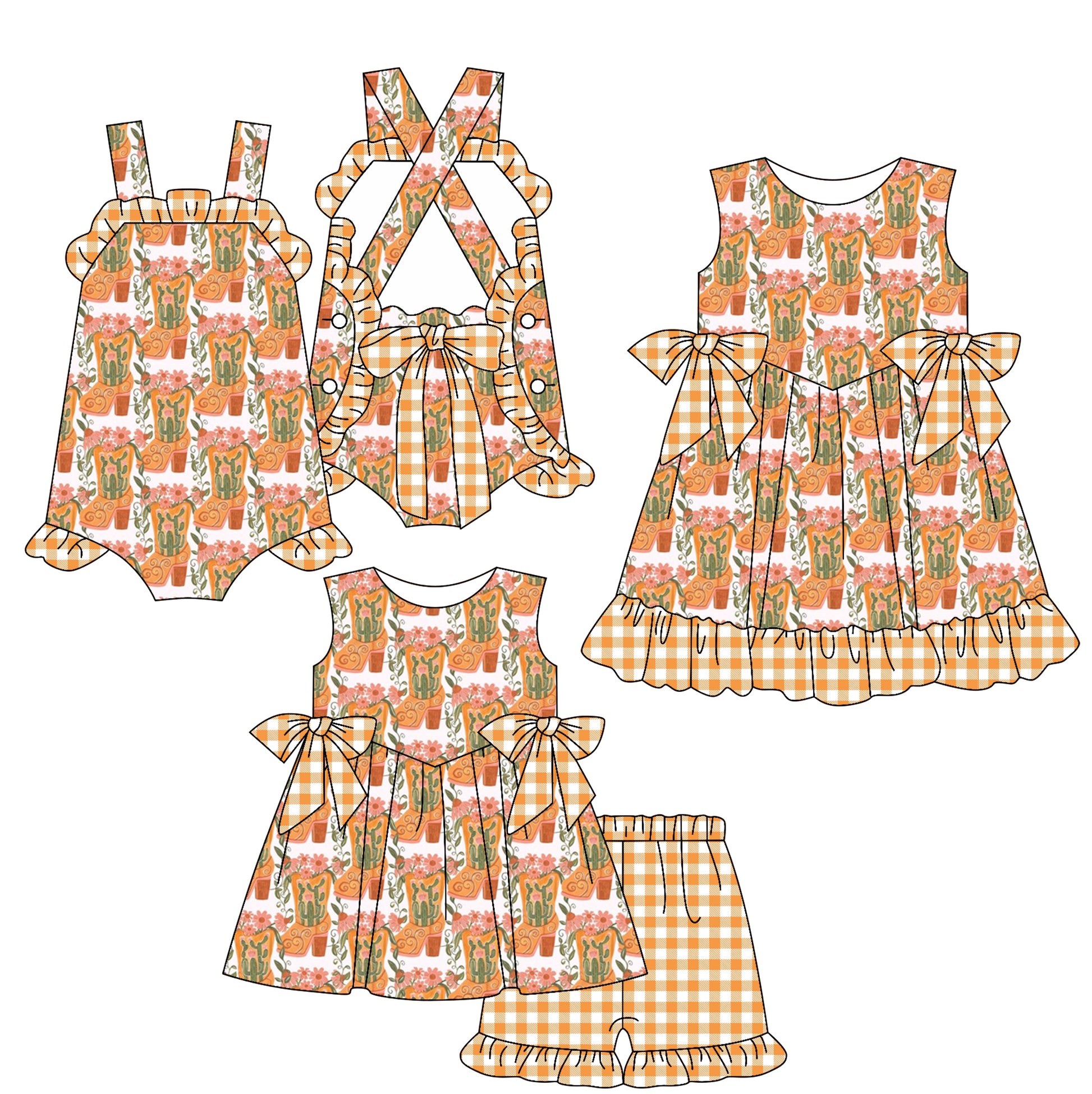 Preorder moq 5 Custom Baby Girls Orange Plaid Strap Floral Boots Bows Tunic Ruffle Short Set Knee Length Dress Rompers