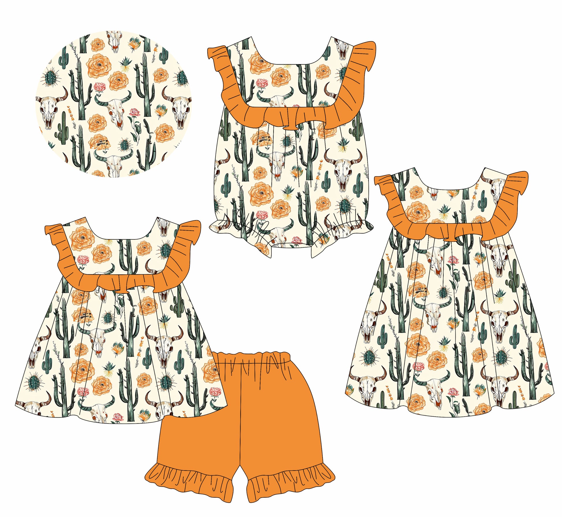 Preorder moq 5 Custom Baby Girls Orange Sleeveless Bull Skull Cactus Tunic Ruffle Short Set Knee Length Dress Rompers
