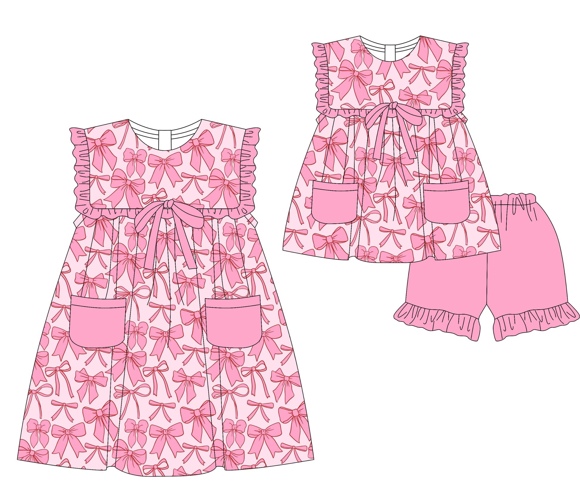 Preorder moq 5 Custom Baby Girls Pink Bows Plaid Pockets Tunic Ruffle Short Set Knee Length Dresses