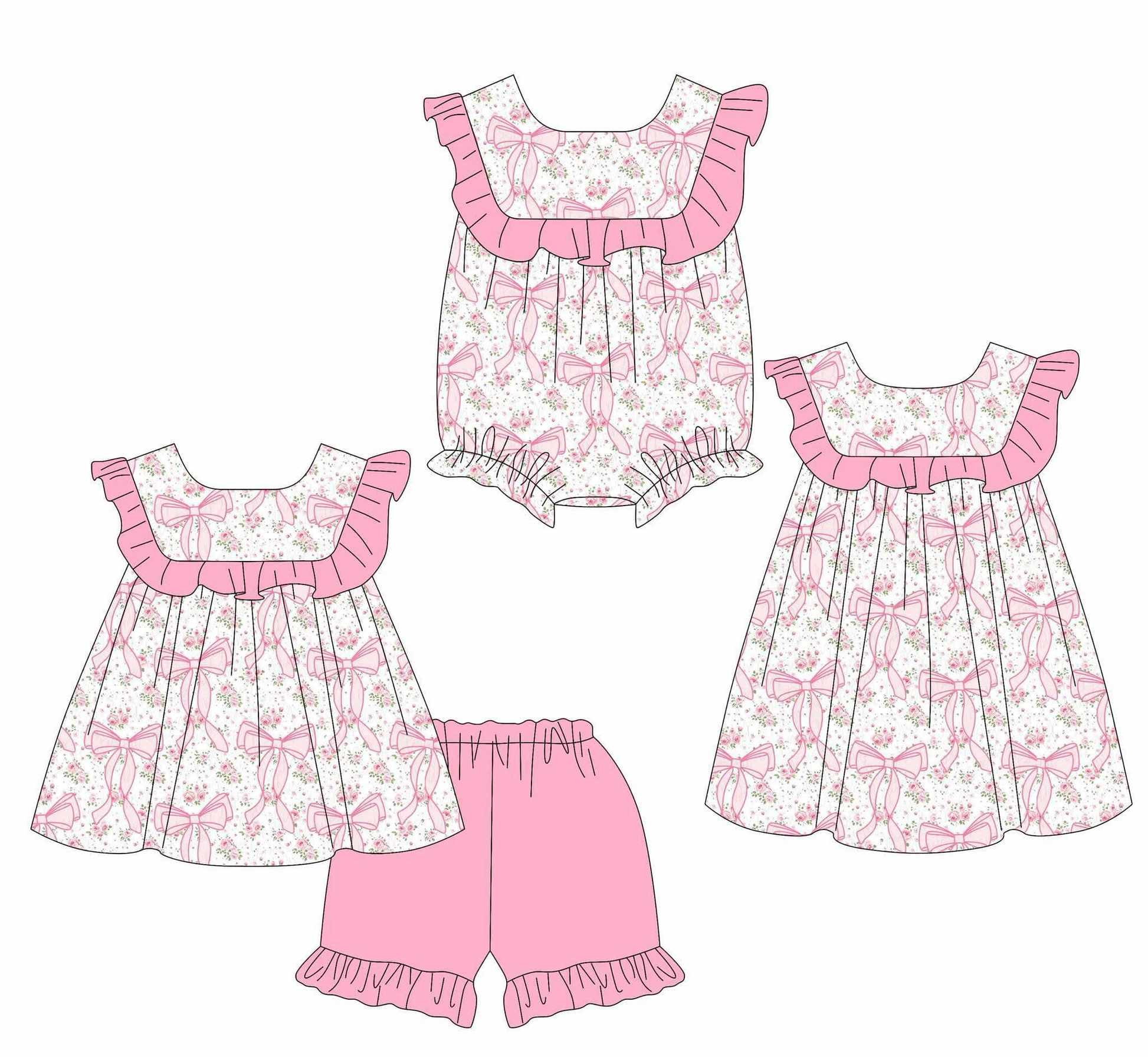 Preorder moq 5 Custom Baby Girls Pink Bows Tunic Short Set Knee Length Dress Rompers