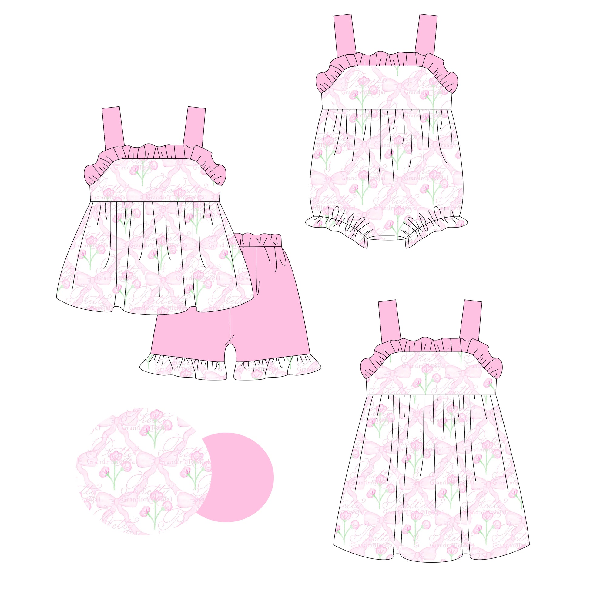 Preorder moq 5 Custom Baby Girls Pink Strap Floral Bows Plaid Tunic Ruffle Short Set Dress And Rompers