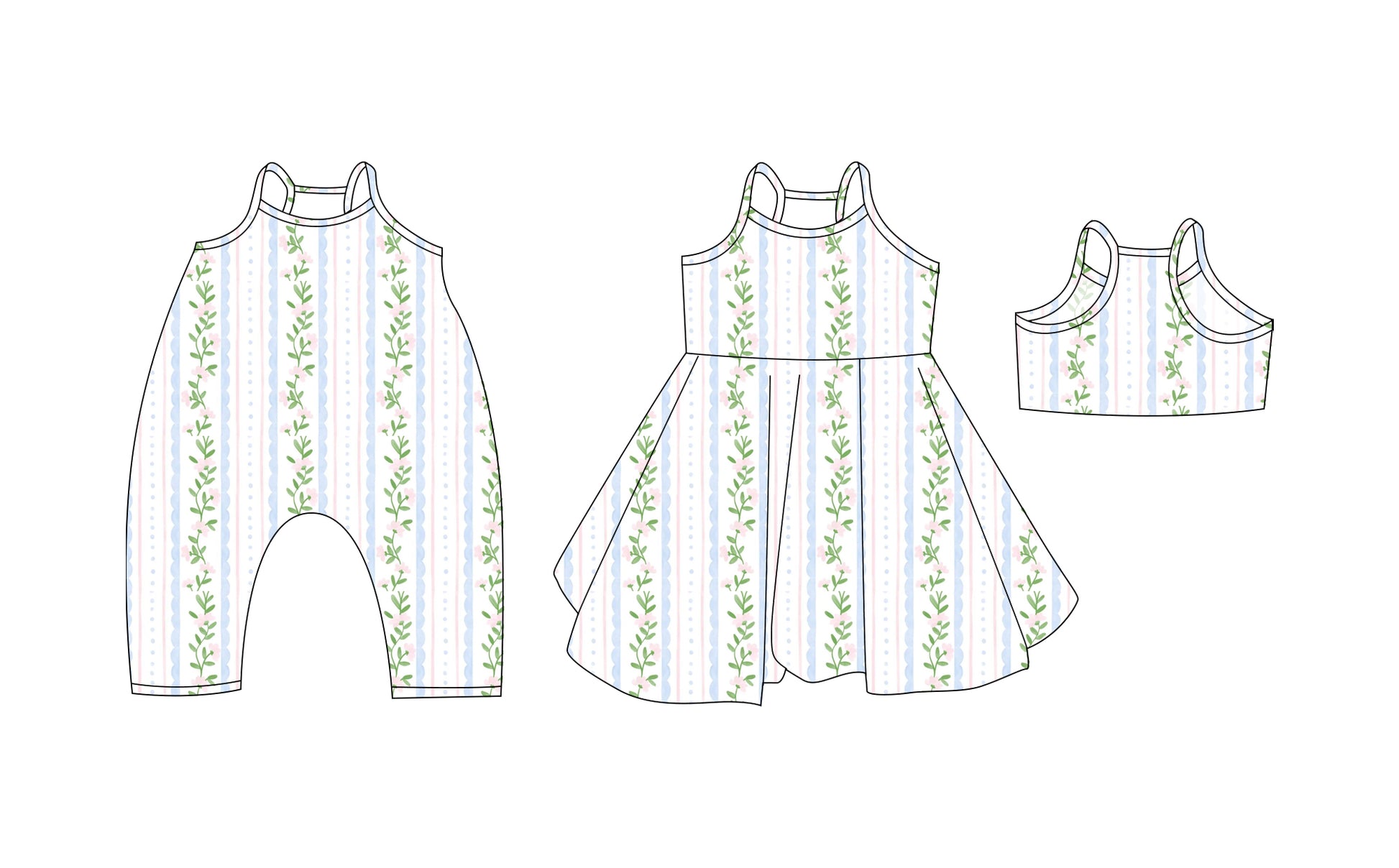 Preorder moq 5 Custom Baby Girls Strap Floral Stripe Knee Length Dresses Romper