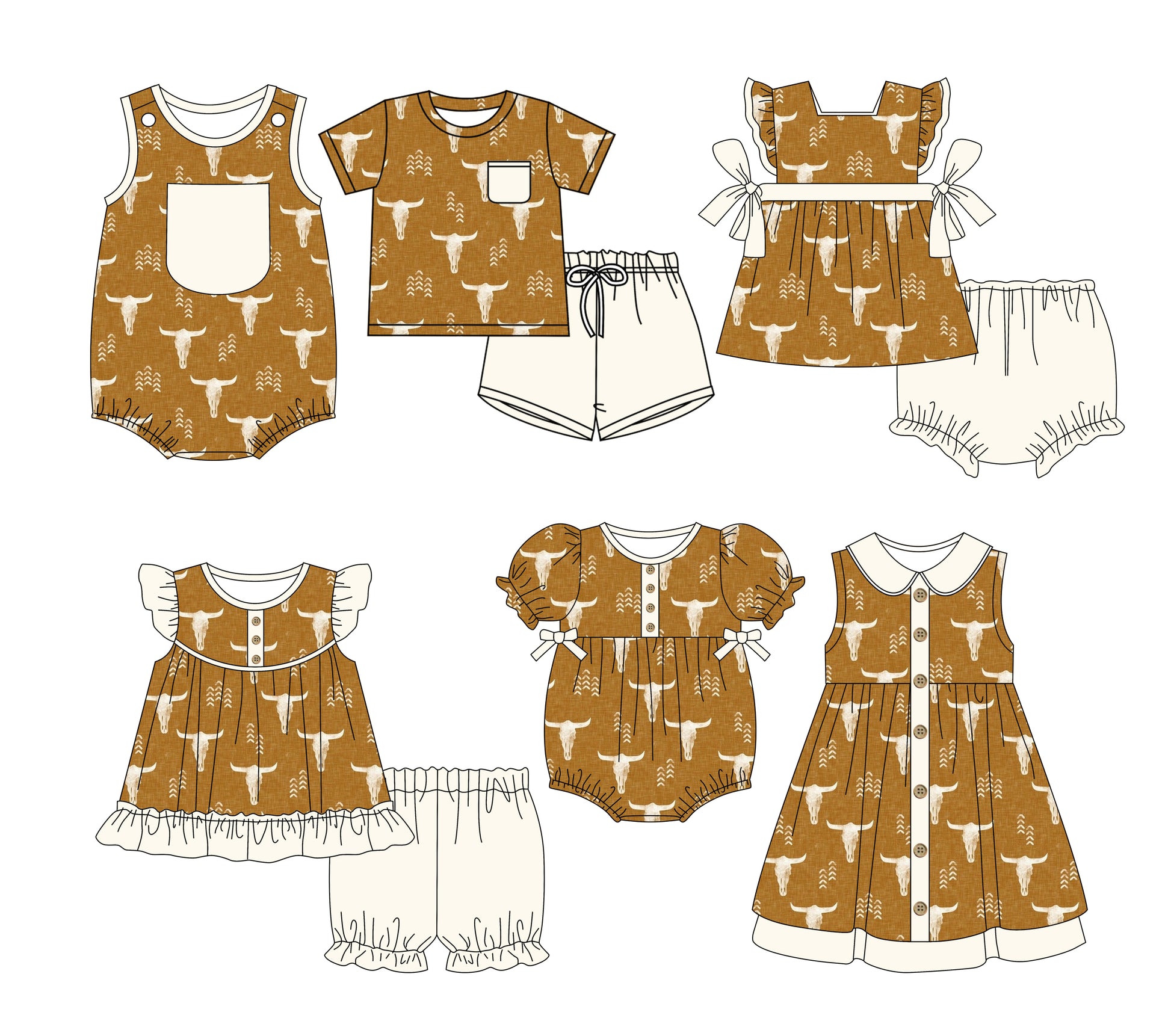 Preorder moq 5 Custom Baby Kids Khaki Pocket Button Bull Skulls Top Short Bummies Sets Dresses And Rompers