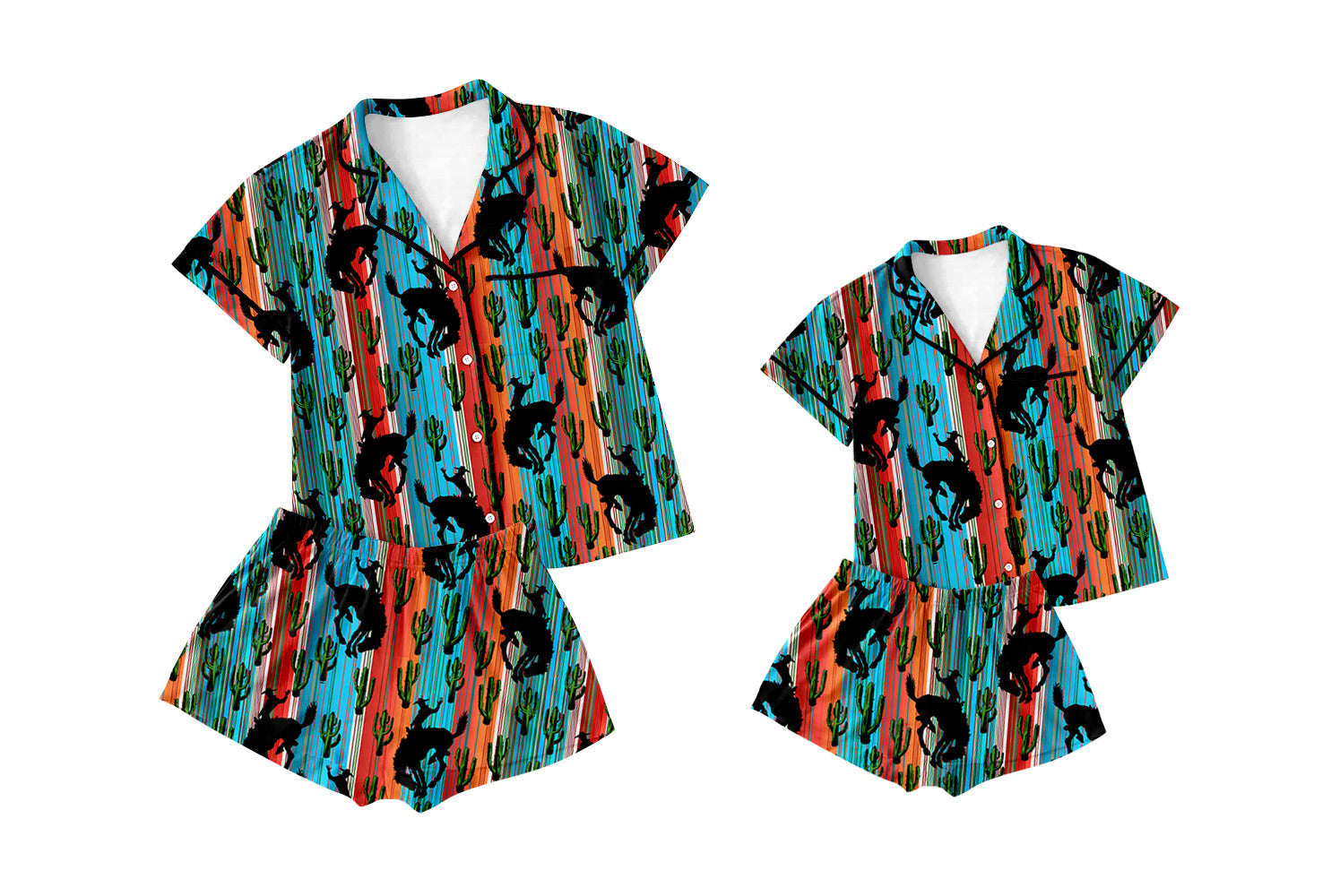 Preorder (moq 5 each) Family Women Baby Girls Cactus Rodeo Western Buttons Top Shorts Pajamas Clothing Sets