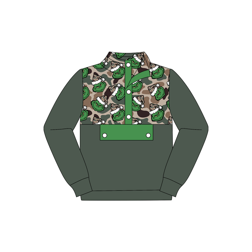 Preorder (moq 5)Baby Boys Christmas Green Faces Camo Button Long Sleeves Pullovers Tops