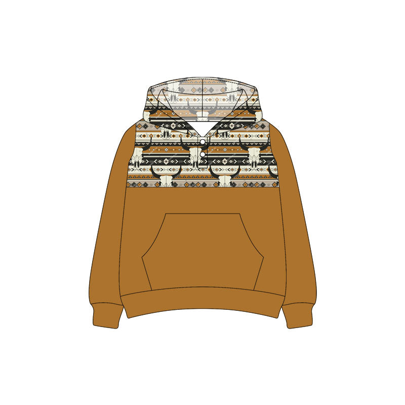 Preorder (moq 5)Baby Boys Western Brown Cow Aztec Hooded Pullovers Tee Shirts