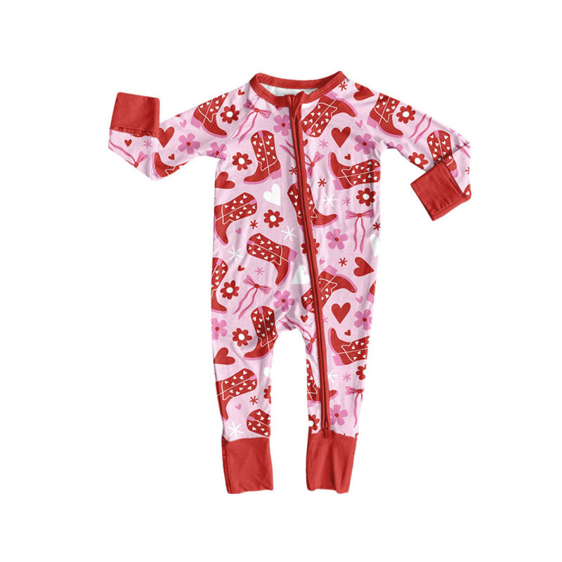 Preorder (moq 5)Baby Girls Boots Bows Flowers Valentine Zipper Footie Rompers