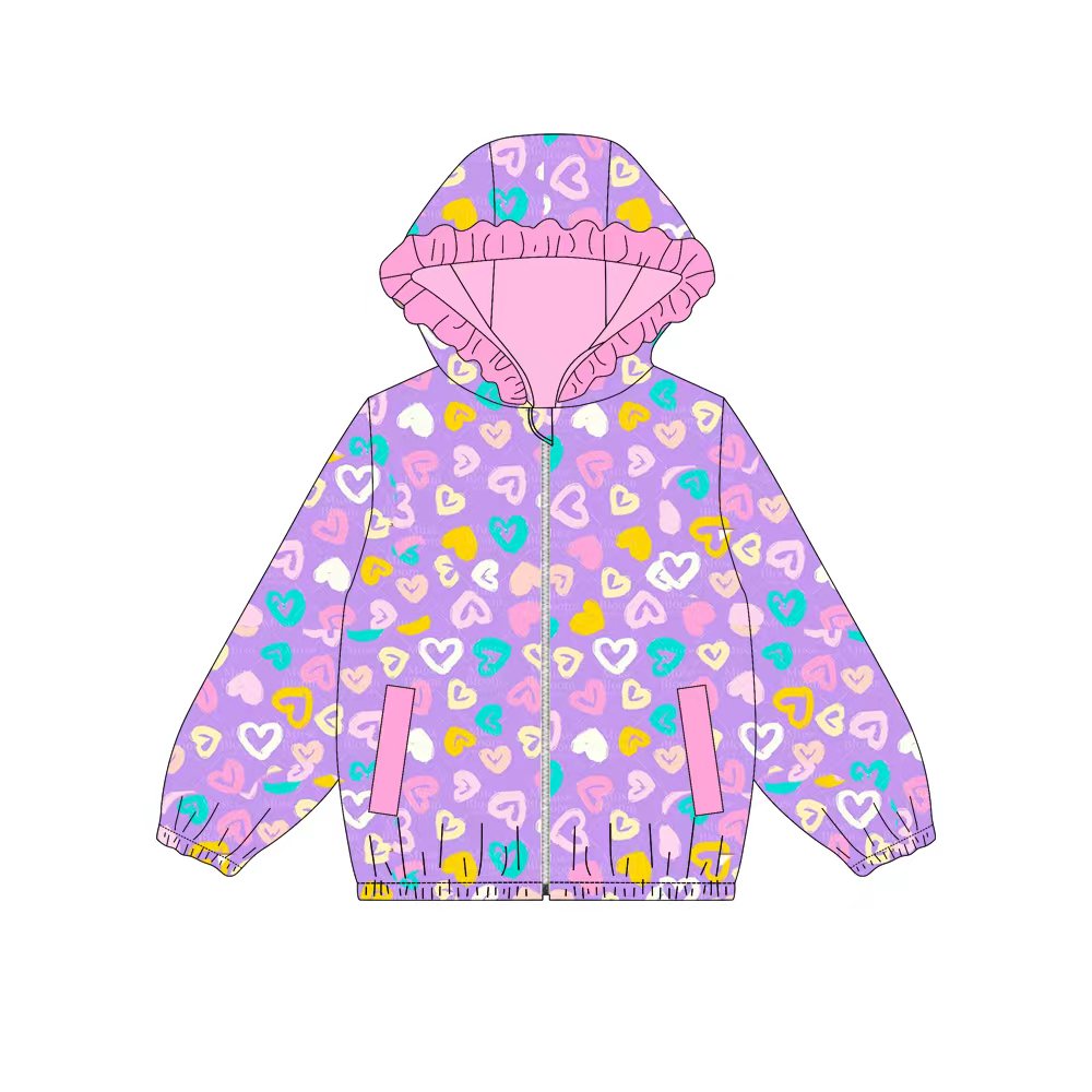 Preorder (moq 5)Baby Girls Colorful Hearts Leopard Pockets Zipper Ruffle Hoodies Jackets Top