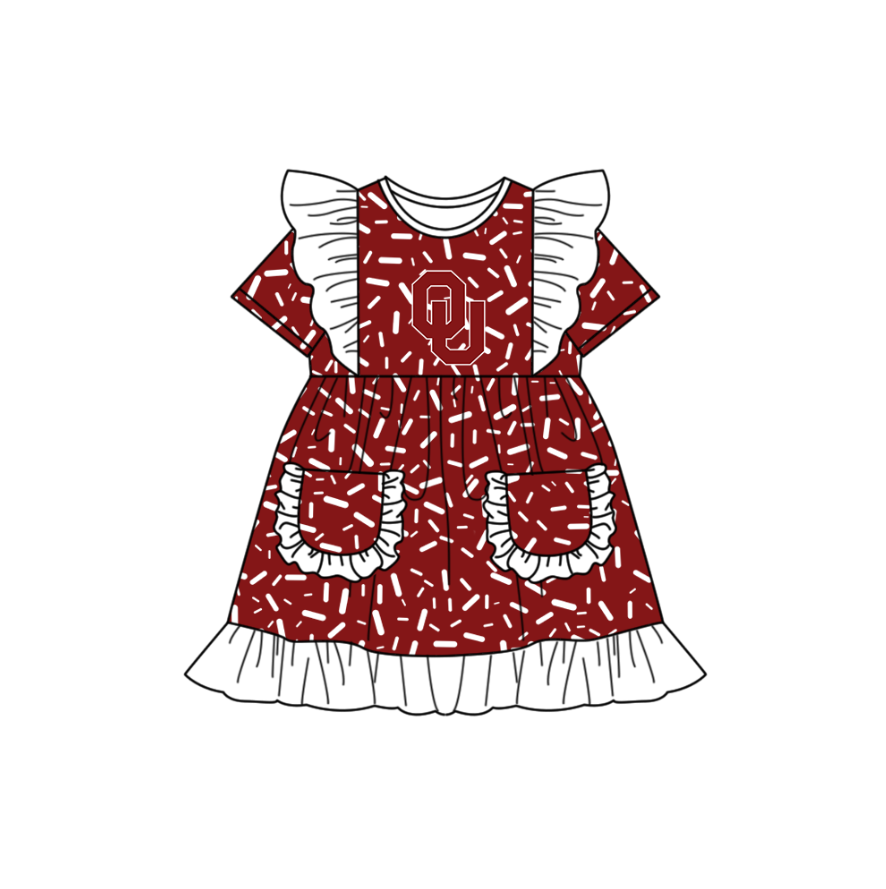 Preorder (moq 5)Baby Girls Flutter Short Sleeve Red Sprinkles OC Pockets Team Ruffle Knee Length Dresses