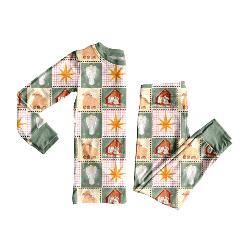 Preorder (moq 5)Baby Girls Green Plaid Nativity Top Pants Christmas Pajamas Clothes Set