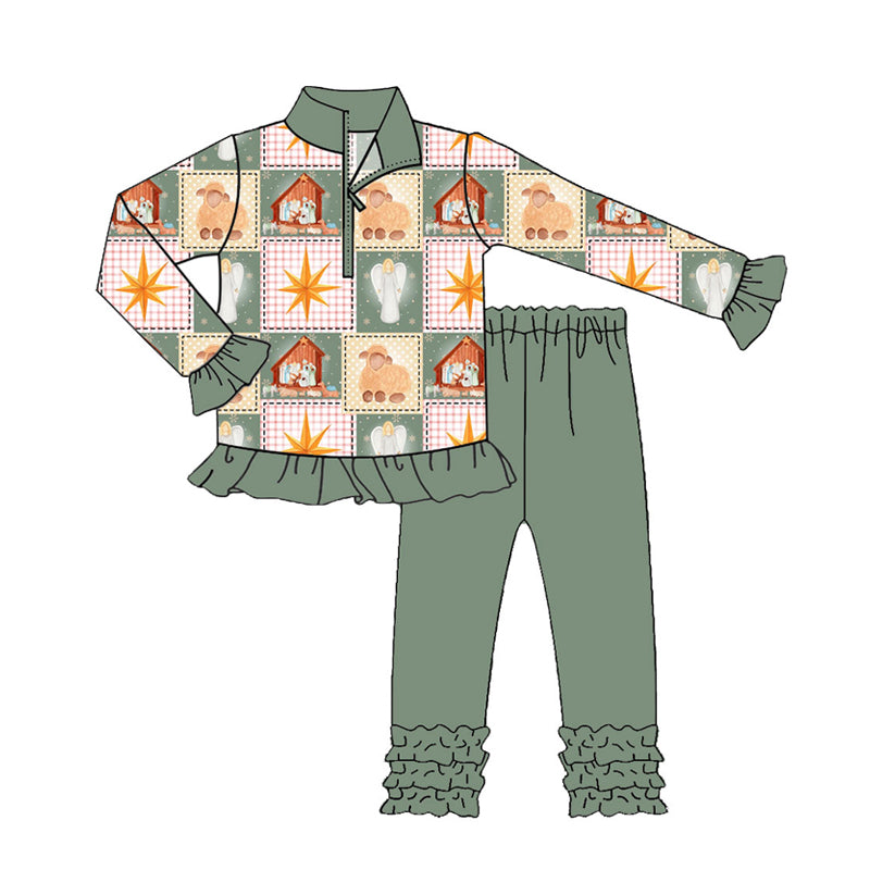 Preorder (moq 5)Baby Girls Green Plaid Nativity Zipper Pullovers Ruffle Leggings Christmas Set
