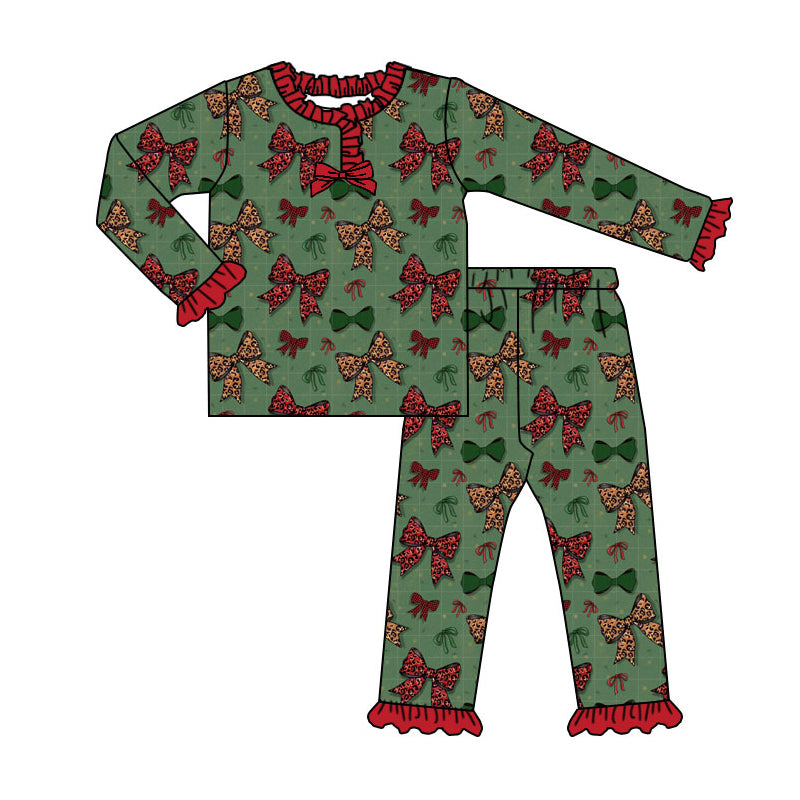 Preorder (moq 5)Baby Girls Green Red Bows Christmas Ruffle Pants Pajamas Sets